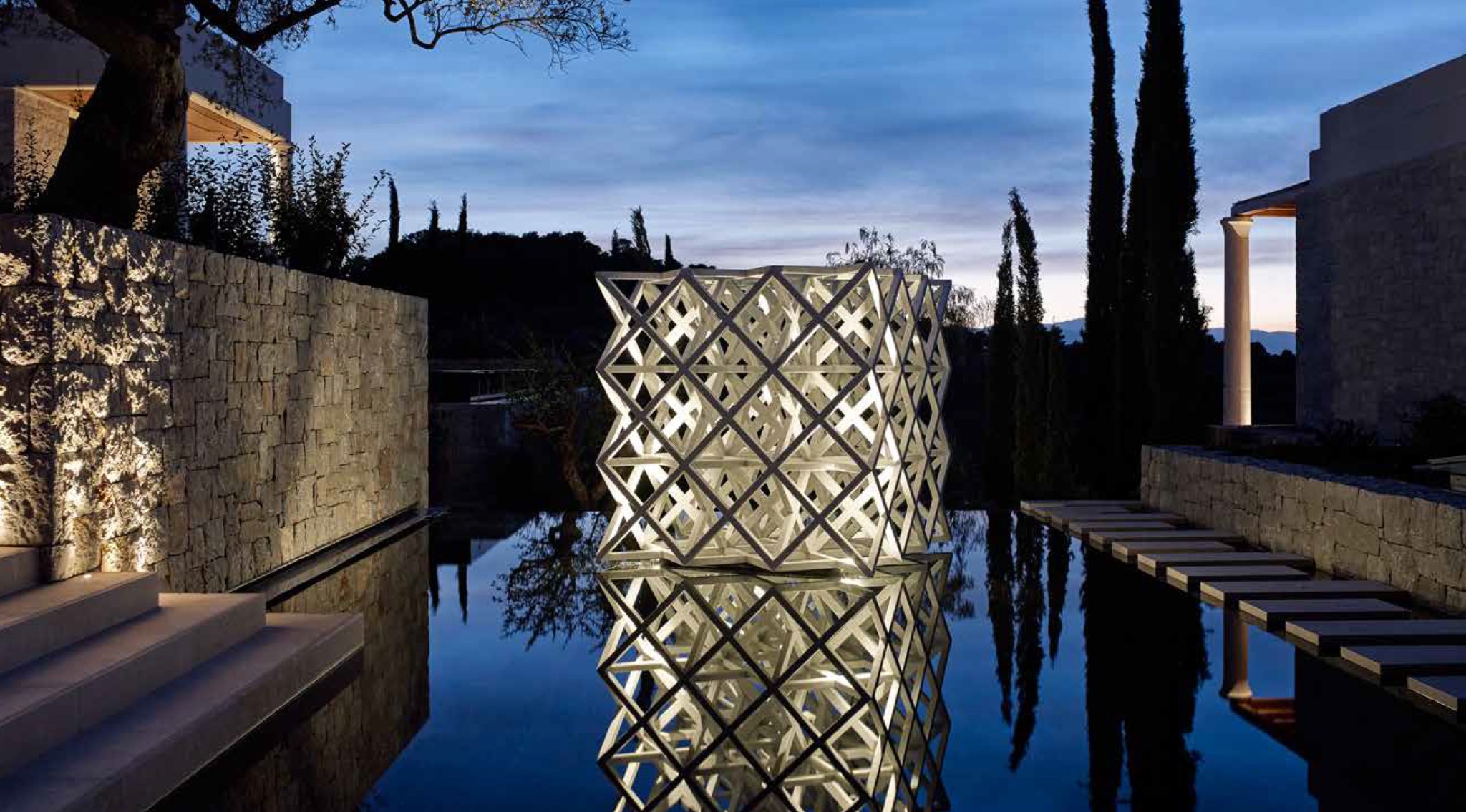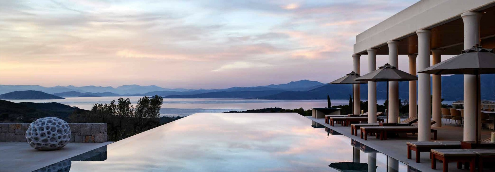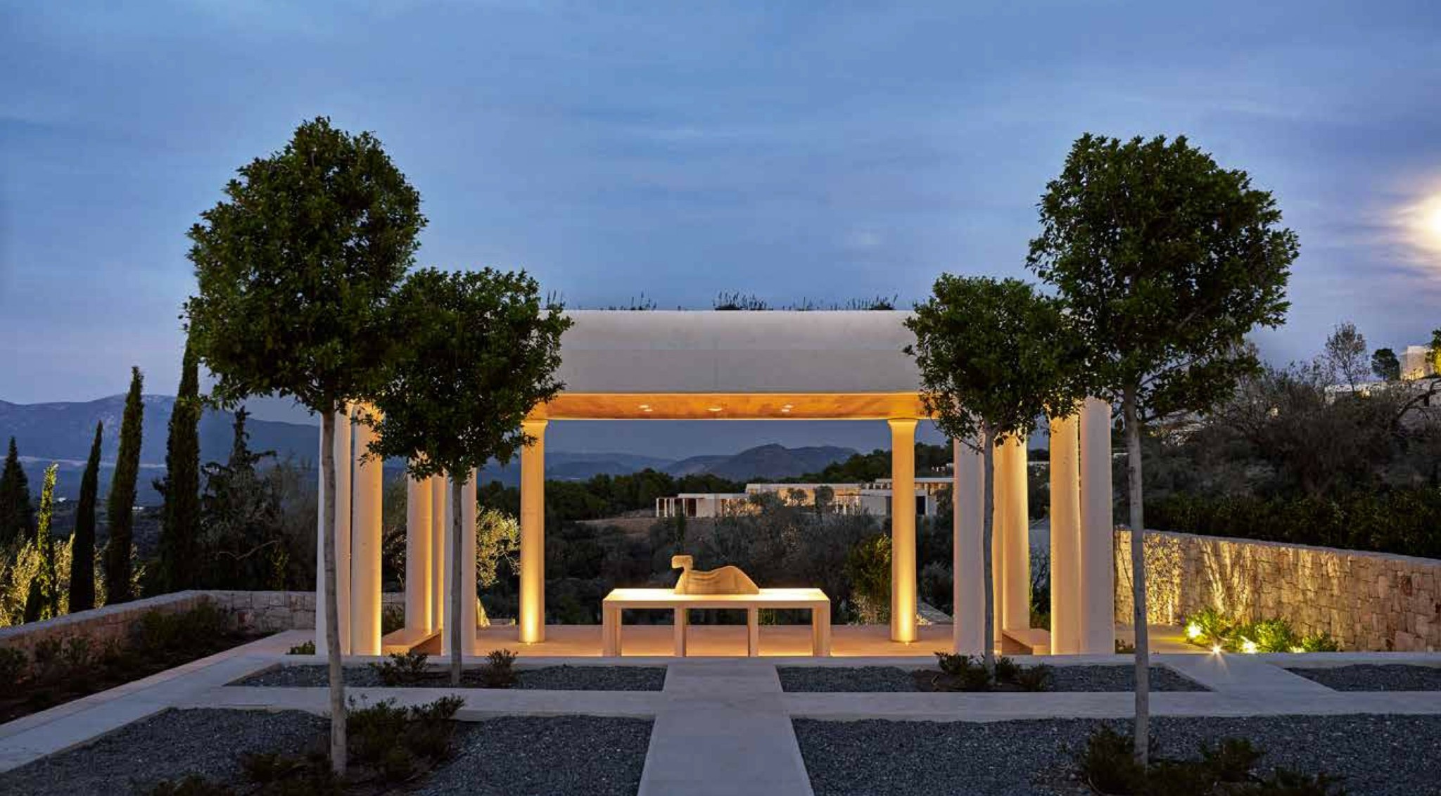 Σχεδιασμένη σαν μια σύγχρονη Ακρόπολη- όπως και το υπόλοιπο πολυτελές Amanzoe -από τους αρχιτέκτονες Edward Tuttle και Μάριο Αγγελόπουλο, αγκαλιάζει την αρχιτεκτονική και την ψυχή της αρχαίας Ελλάδας. Υψηλή αισθητική, ιδιωτικότητα και γαλήνη.