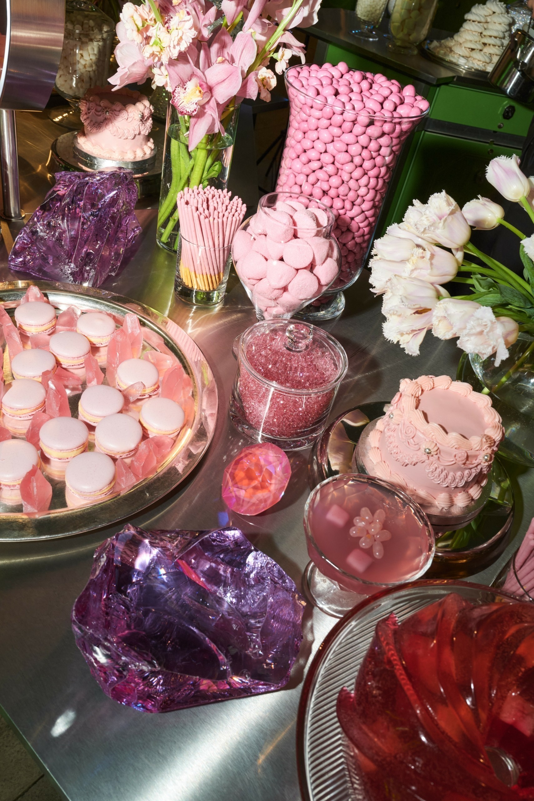 Αξίζει να εστιάσουμε στην ιδιαίτερη διακόσμηση του χώρου όπου τα τεράστια displays σε συνδυασμό με τα εντυπωσιακά λουλούδια ύψους δύο μέτρων, τα μικρά γυάλινα βάζα διακοσμημένα με κρύσταλλα, χρωματιστές καραμέλες και μπισκότα στο σχήμα και στα χρώματα και των τριών τσαντών, αναμφίβολα τραβούσαν την προσοχή των καλεσμένων. Οι σταρ του interior έδωσαν ρεσιτάλ!