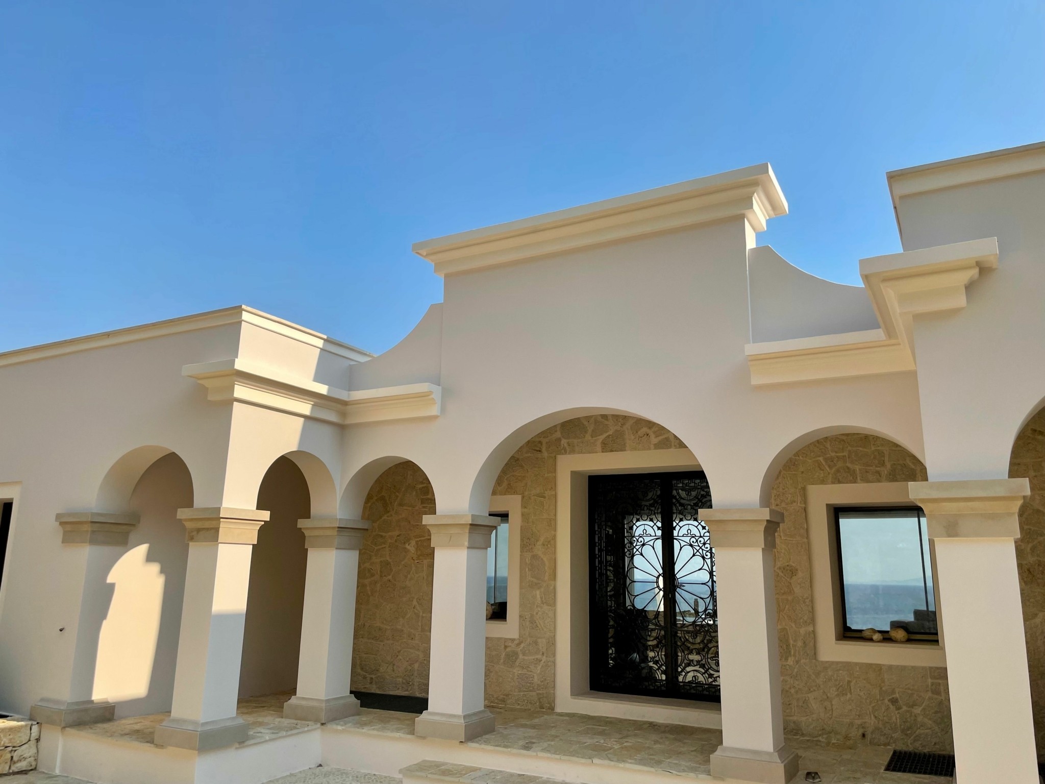 Τα παράθυρα ενισχύουν την πανοραμική θέα και η πέτρα που χρησιμοποιείται στην πρόσοψη και στους εξωτερικούς τοίχους, η οποία προέρχεται από την ίδια την περιοχή, προσδίδει αισθητική υπεροχή και ζεστασιά.