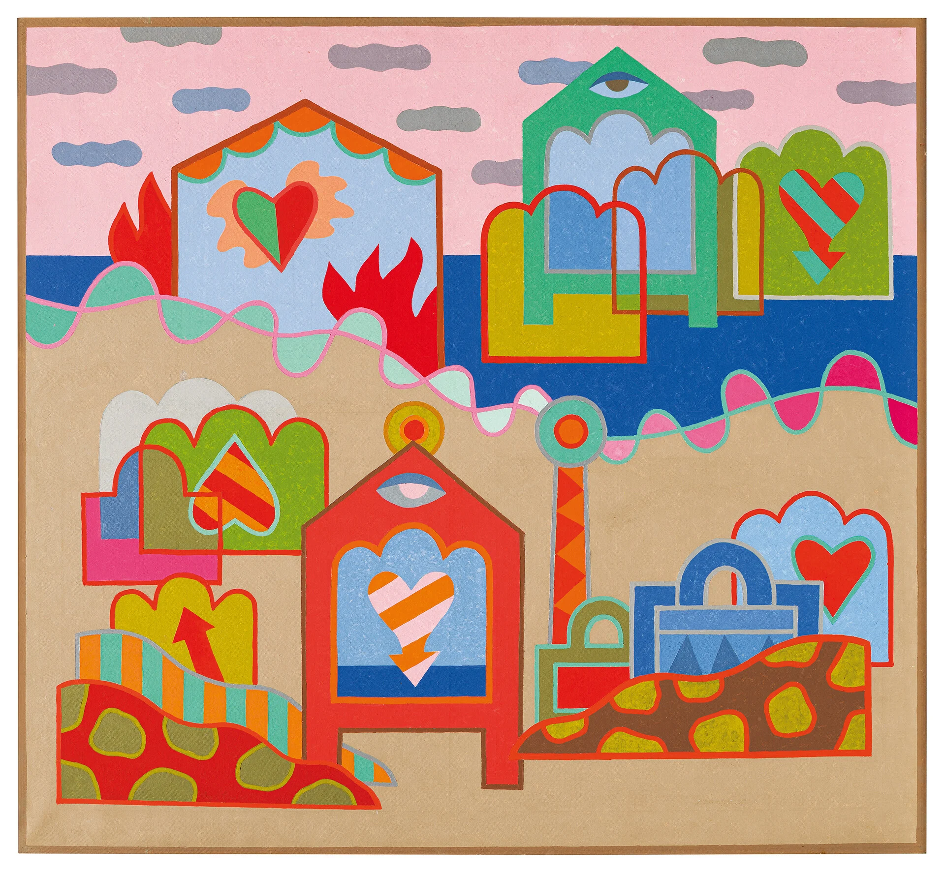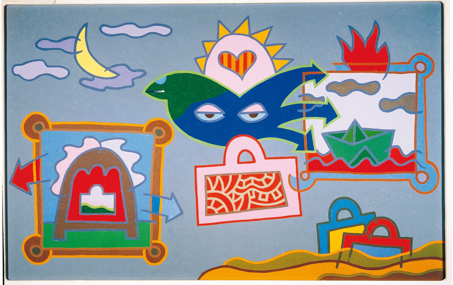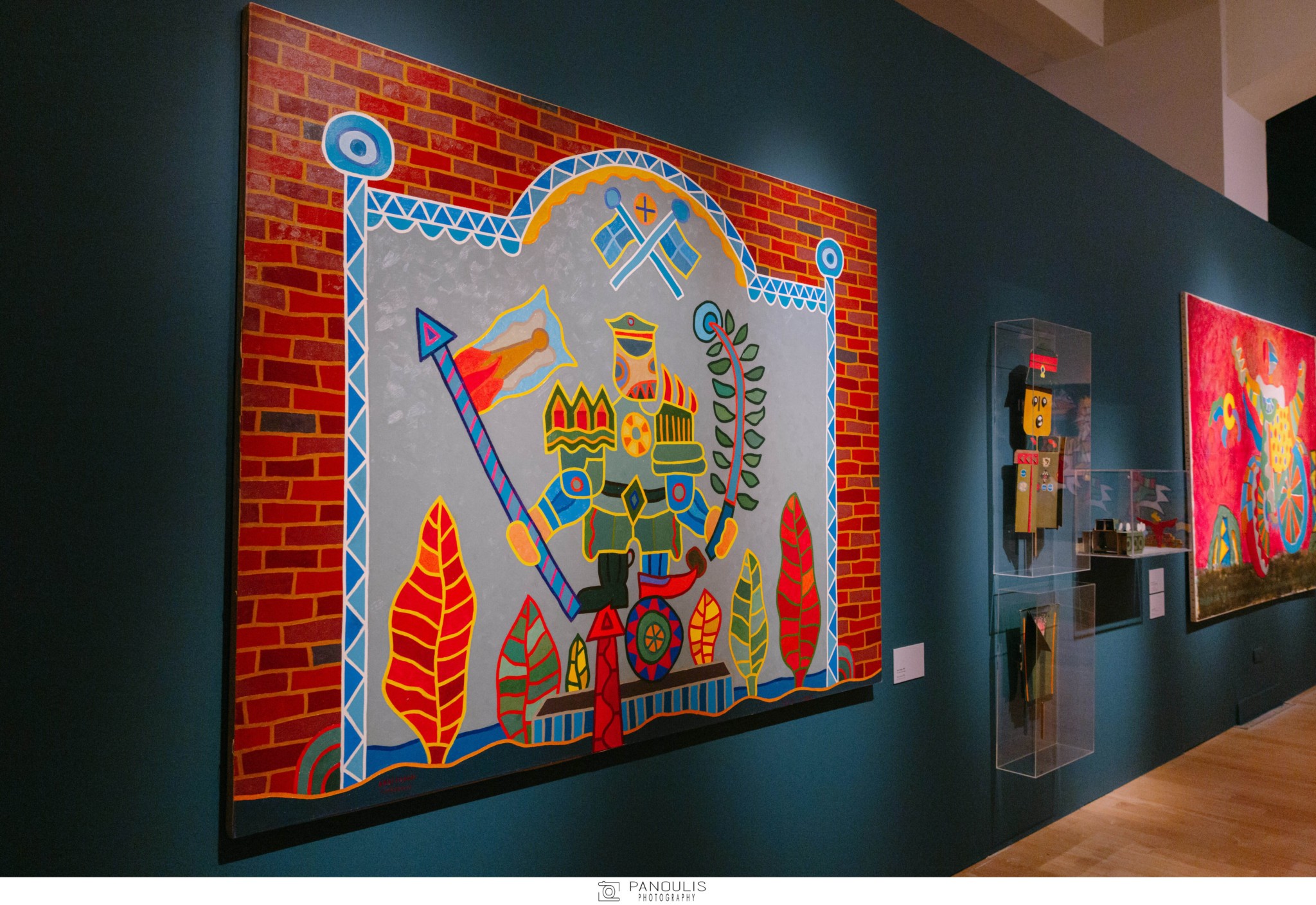 Από τις πρώτες ψυχεδελικές εικόνες του Αλέξη Ακριθάκη που αποτυπώνουν το πνεύμα της δεκαετίας του ’60, την εμβληματική «βαλίτσα» του ’70, τις κατασκευές με λαμπάκια που αποδομούν τη ζωγραφική σε υλικά, ατμόσφαιρες και προθέσεις, τα εξπρεσσιονιστικά τοπία και τα διεισδυτικά πορτρέτα έως τα σπαρακτικά τελευταία του έργα με τους τρελούς και τους τρόφιμους του «Δρομοκαϊτείου».