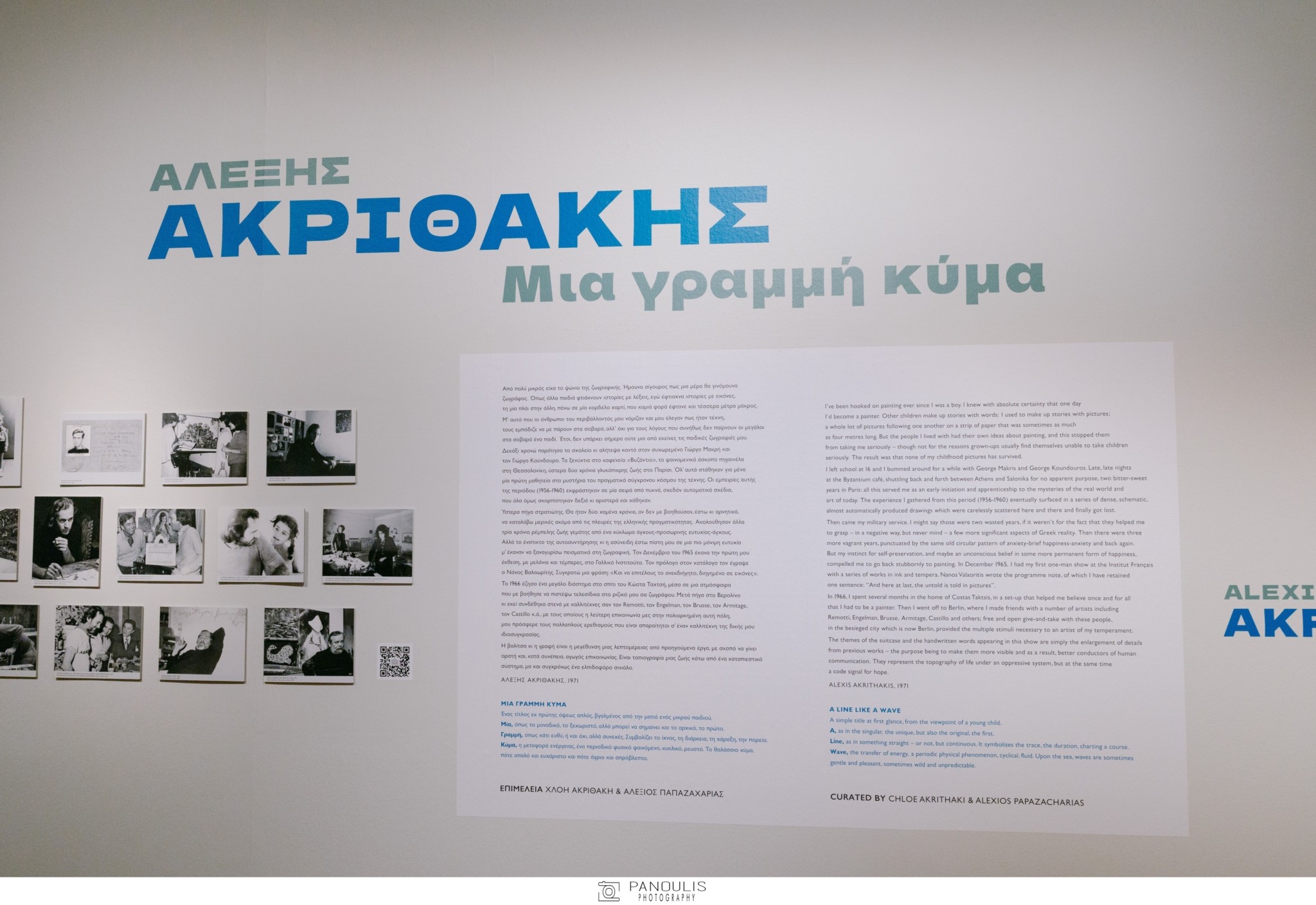 Η έκθεση «Αλέξης Ακριθάκης, Μια γραμμή κύμα», σε επιμέλεια της Χλόη Ακριθάκη και του Αλέξιου Παπαζαχαρία, είναι η πρώτη μεγάλη αναδρομική έκθεση του σημαντικού Έλληνα δημιουργού στην Ελλάδα, τα τελευταία 30 χρόνια και μεταξύ άλλων παρουσιάζει για πρώτη φορά στο κοινό σημαντικά έργα από ιδιωτικές και δημόσιες συλλογές, αναδεικνύοντας το εύρος μιας από τις πιο αναγνωρίσιμες και ιδιοσυγκρασιακές μορφές της νεοελληνικής τέχνης.