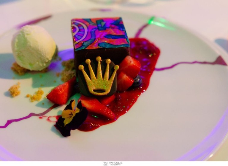 Η βραδιά έκλεισε με ριζότο σπαραγγιών και φιλέτο σινιόν από το Δειπνοσοφιστήριον που ξέρει να ικανοποιεί και τους πιο απαιτητικούς ουρανίσκους. Οσο για το γλυκό; Αποτύπωνε αριστοτεχνικά τι άλλο; από ένα έργο Ακριθάκη. O pastry chef είχε κάνει την δική του τέχνη…