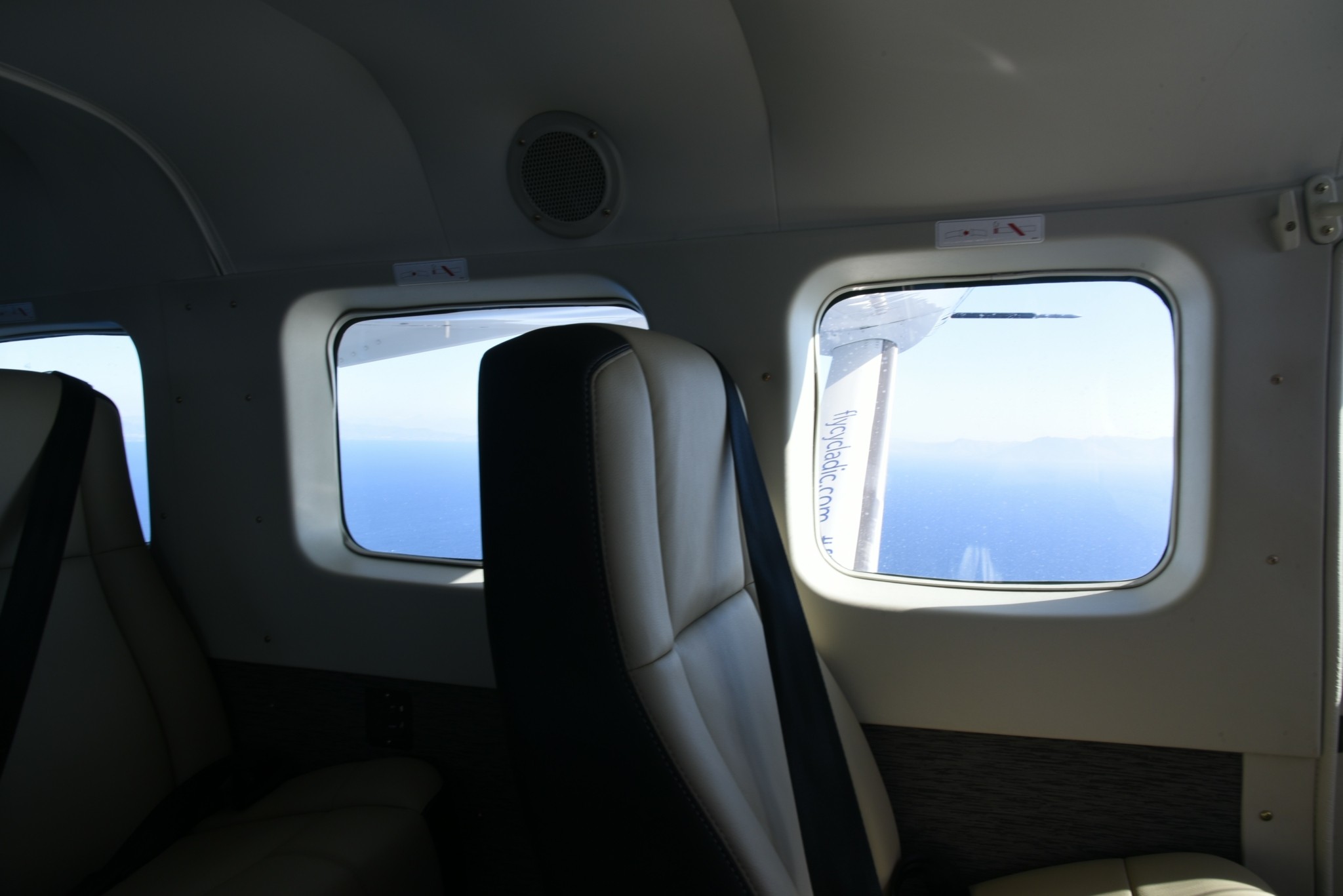 Η θέα από το παράθυρο κερδίζει τις εντυπώσεις. Ένα καλοκαιρινό τοπίο με μπλε αποχρώσεις του Αιγαίου εναλλάσσεται με νησιά. Τα αεροσκάφη της Cycladic πετούν σε χαμηλό υψόμετρο και διαθέτουν μεγάλα παράθυρα, γεγονός που επιτρέπει σε κάθε επιβάτη να απολαμβάνει τη θέα κατά το μέγιστο δυνατό.
