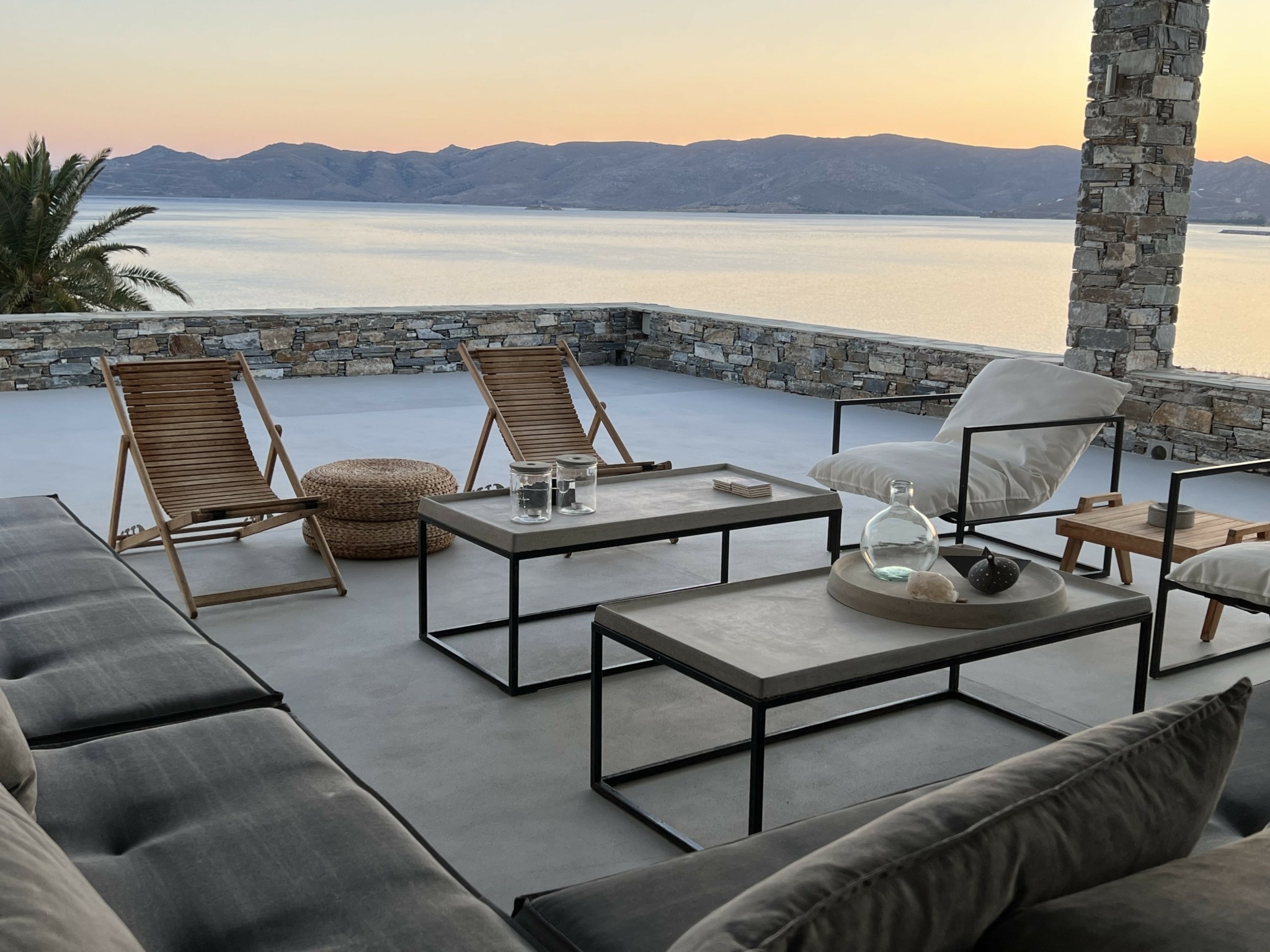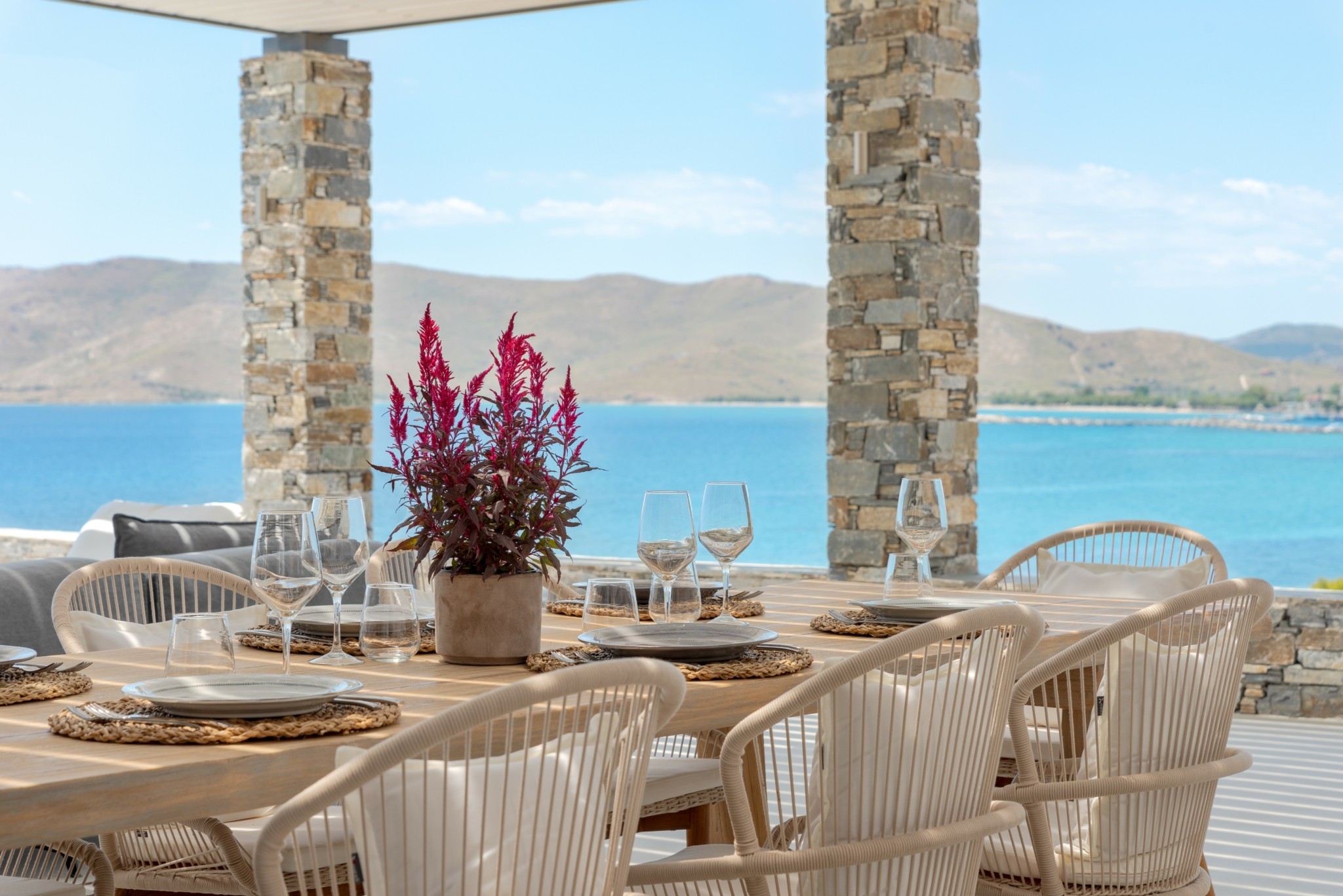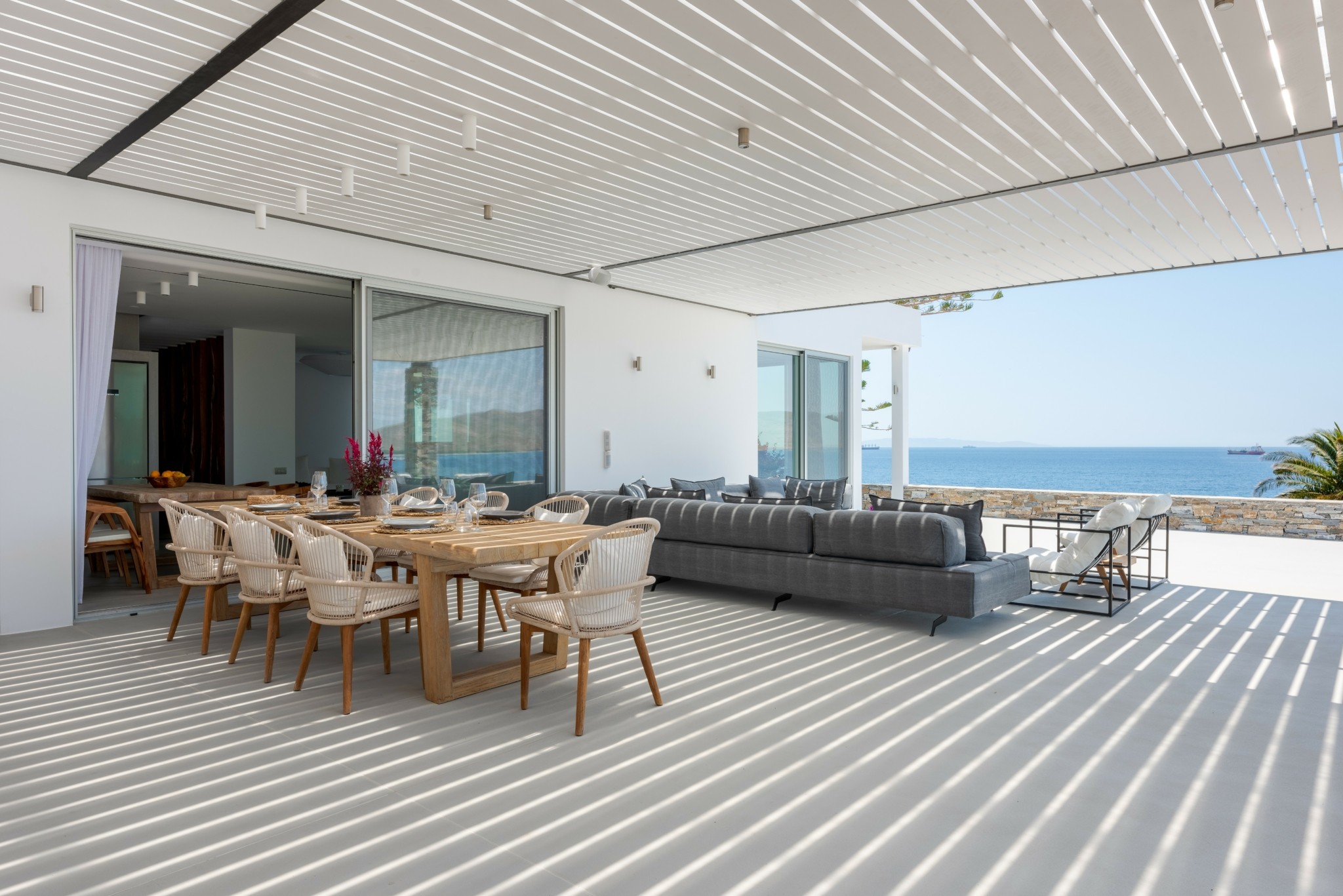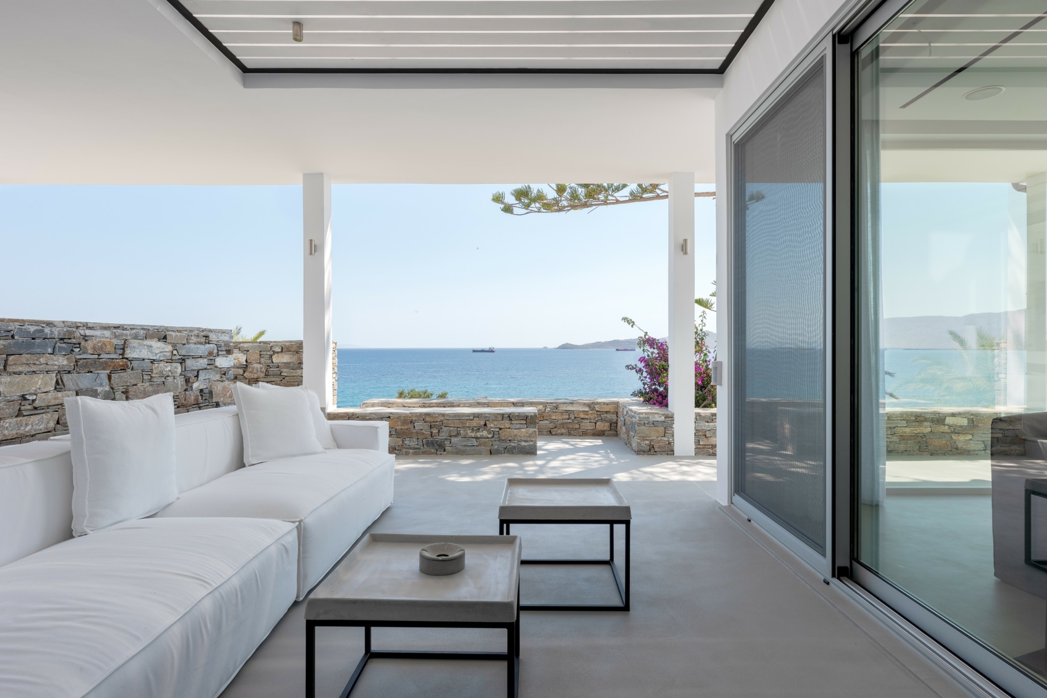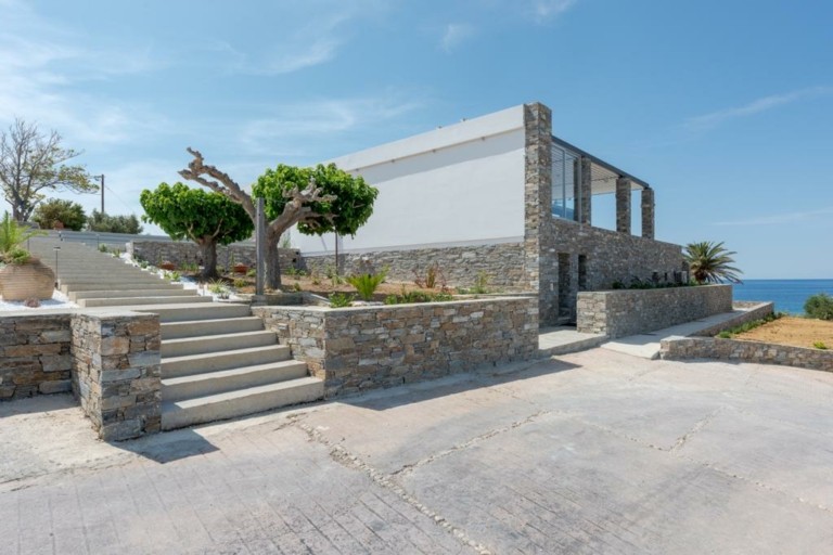 Βρίσκεται σε ύψωμα και επομένως δεσπόζει στην περιοχή, κάποιοι εξωτερικοί χώροι θυμίζουν την πλώρη καραβιού, τα παράθυρα φινιστρίνια ενώ διαθέτει πολλά ευρύχωρα δωμάτια, εξωτερική επένδυση με ντόπια πέτρα, υπέροχους κήπους, ιδιωτικό λιμανάκι και μοναδική θέα… το απέραντο γαλάζιο του Αιγαίου.