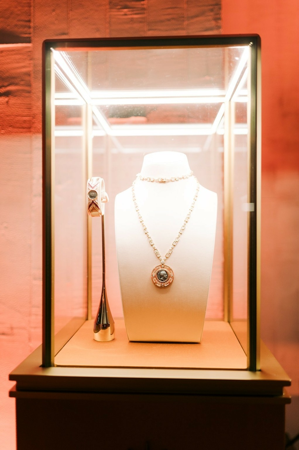 Ο σκουρόχρωμος χώρος με την ατμοσφαιρική ambiance που απέπνεε αγάπη στην δημιουργικότητα, στο εκλεπτυσμένο design και τα καράτια είχε διακοσμηθεί με προθήκες όπου μυθικές δημιουργίες του οίκου με διαμάντια, ζαφείρια και άλλους πολύτιμους λίθους μυούσαν τους καλεσμένους στις τελευταίες δημιουργίες Bvlgari. To δίχως άλλο μαγεία!