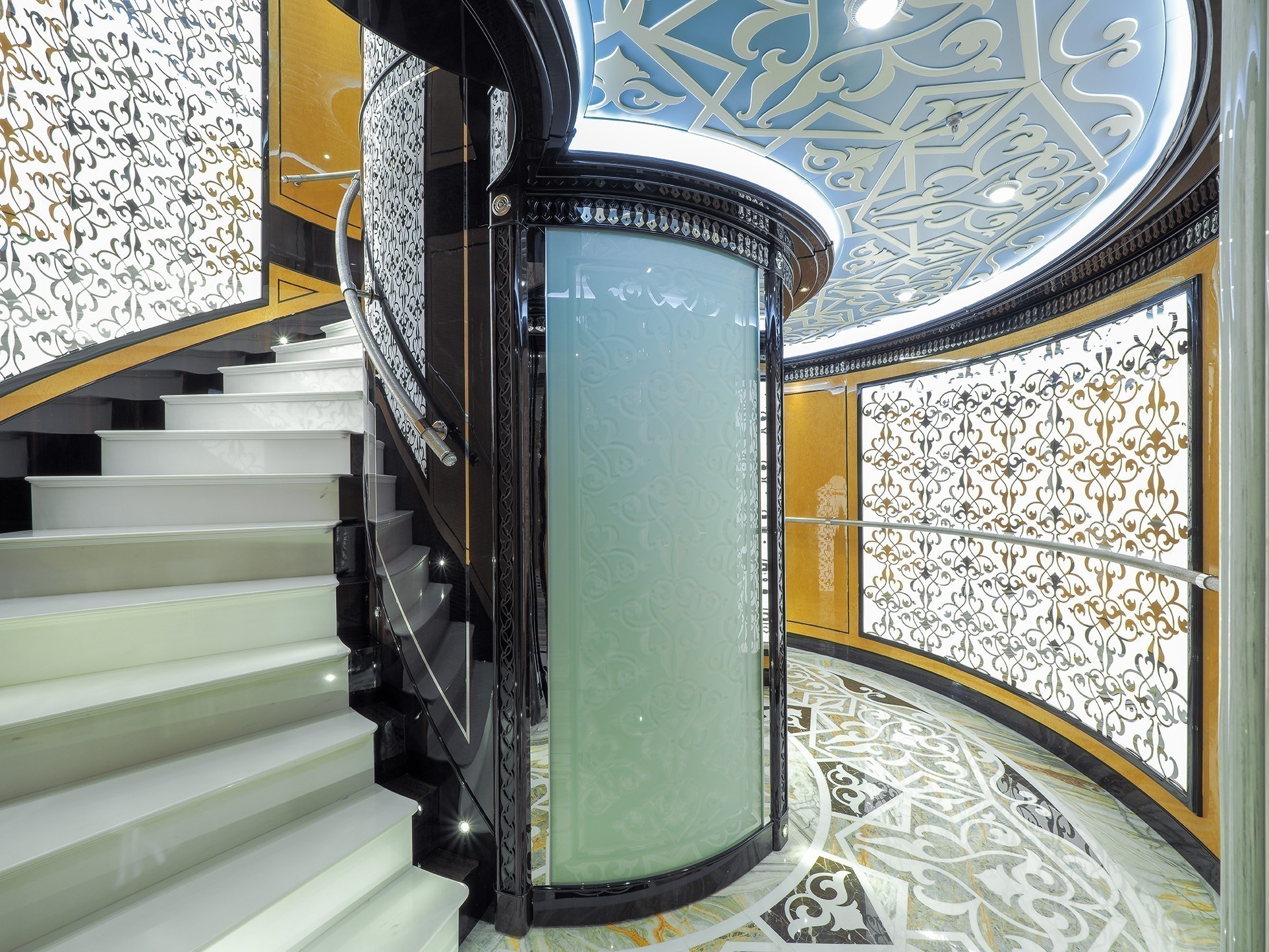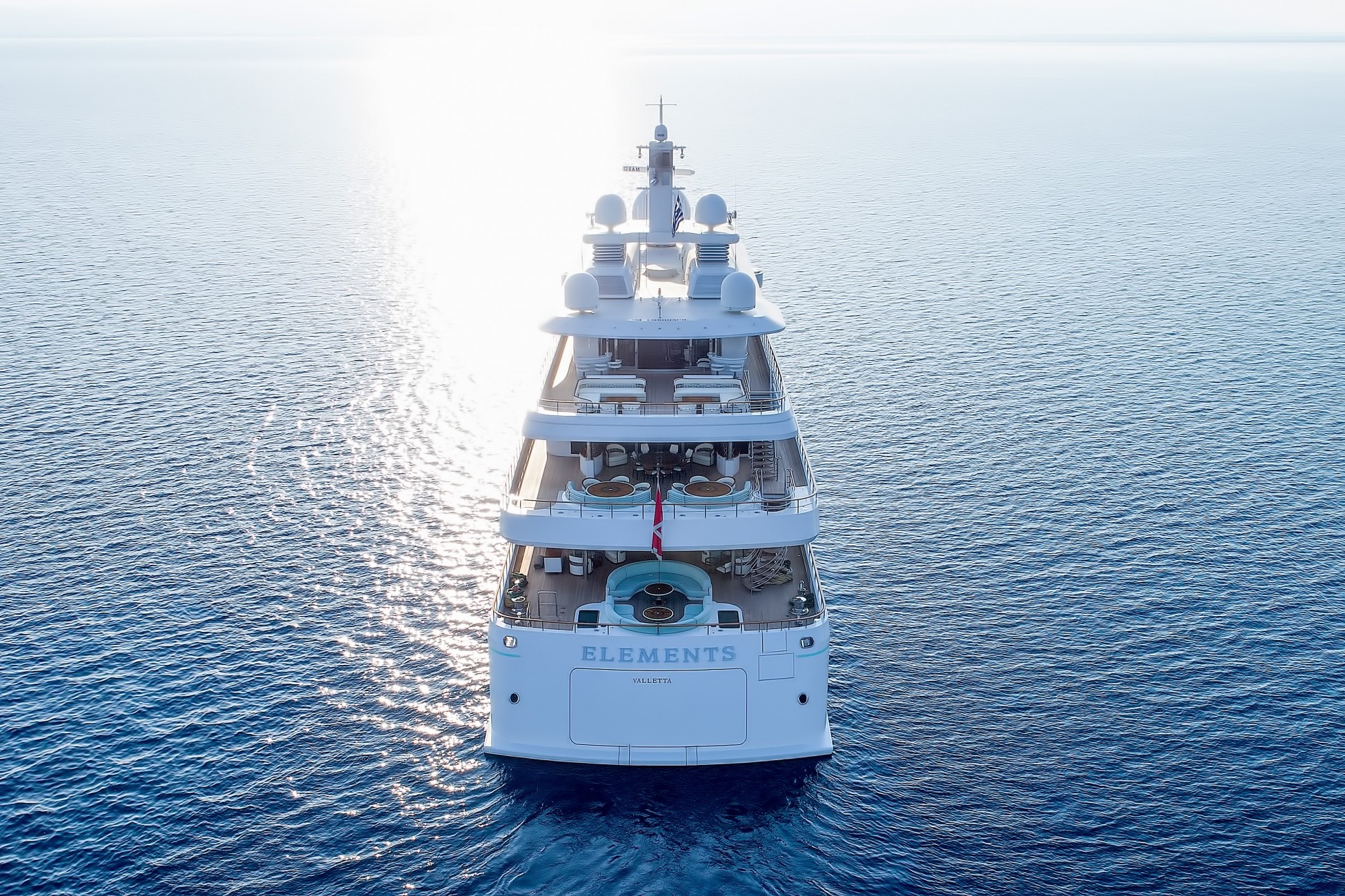 Το Yacht που έχει την ονομασία Elements είναι μήκους 90 μ., ναυπηγήθηκε σε ναυπηγείο του εξωτερικού και έχει πολύ υψηλού επιπέδου interior design, μέσα σε oriental πνεύμα και αισθητική καθότι ο ιδιοκτήτης του είναι αραβικής καταγωγής. Ρωτώ τι σημαίνει «ακριβή κατασκευή» για να εισπράξω την απάντηση: «Χρησιμοποιήθηκαν ψαγμένα υλικά που επιλέχθηκαν με κριτήριο τόσο την ομορφιά, όσο και την ποιότητα. Ακριβοί καπλαμάδες, δέρματα από καρχαρία, σπάνια μάρμαρα, φωτισμένοι όνυχες, κρύσταλλα, ειδικά διαμορφωμένα πάνελ, custom – made έπιπλα κ.λπ.». Το συγκεκριμένο σκάφος, σαφώς αραβικής αισθητικής, ήταν υποψήφιο για τα βραβεία Word Super yachts το 2020, στο Μονακό.
