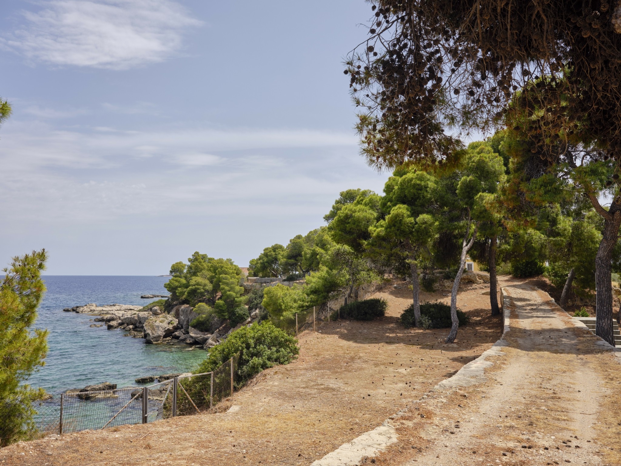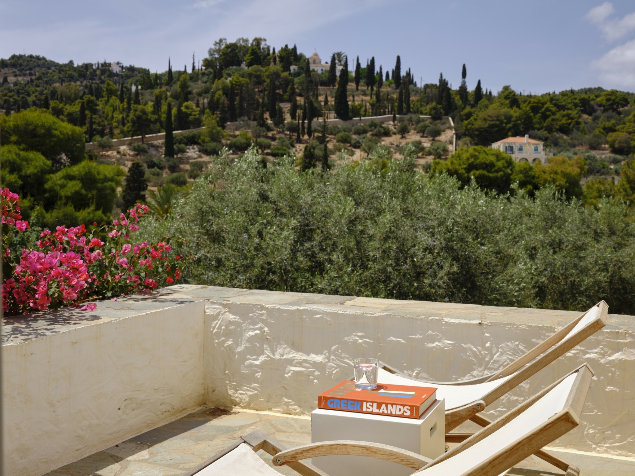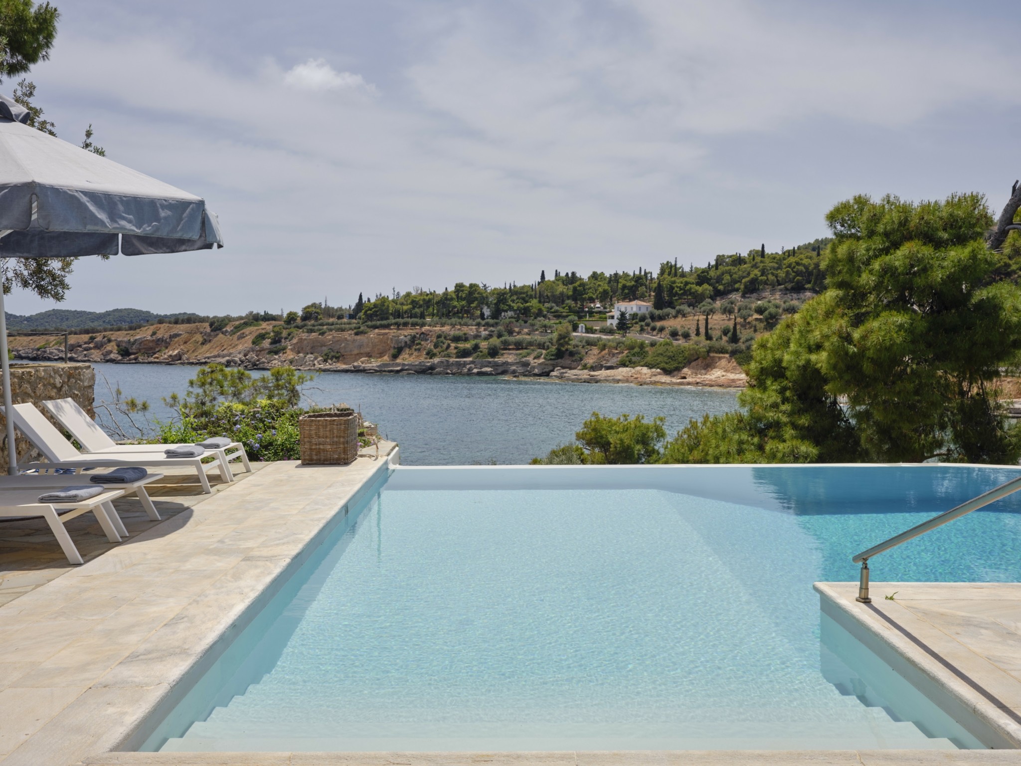 Χτισμένο σε ένα κατάφυτο περιβάλλον, το Pine Estate, όπως ονομάζεται, προσφέρει πανοραμική θέα στα νησάκια των jet setters, Σπετσοπούλας, Τρίκερι και Αγίου Ιωάννη, φτάνοντας μέχρι την Ύδρα. Η πλούσια βλάστηση –από αιωνόβια ελαιόδεντρα, πεύκα και κυπαρίσσια μέχρι αρωματικά φυτά– συνθέτει έναν φυσικό παράδεισο, ενώ τα παιχνιδίσματα του φωτός στο τοπίο προσφέρουν μαγευτικές εικόνες από την αυγή έως το ηλιοβασίλεμα.