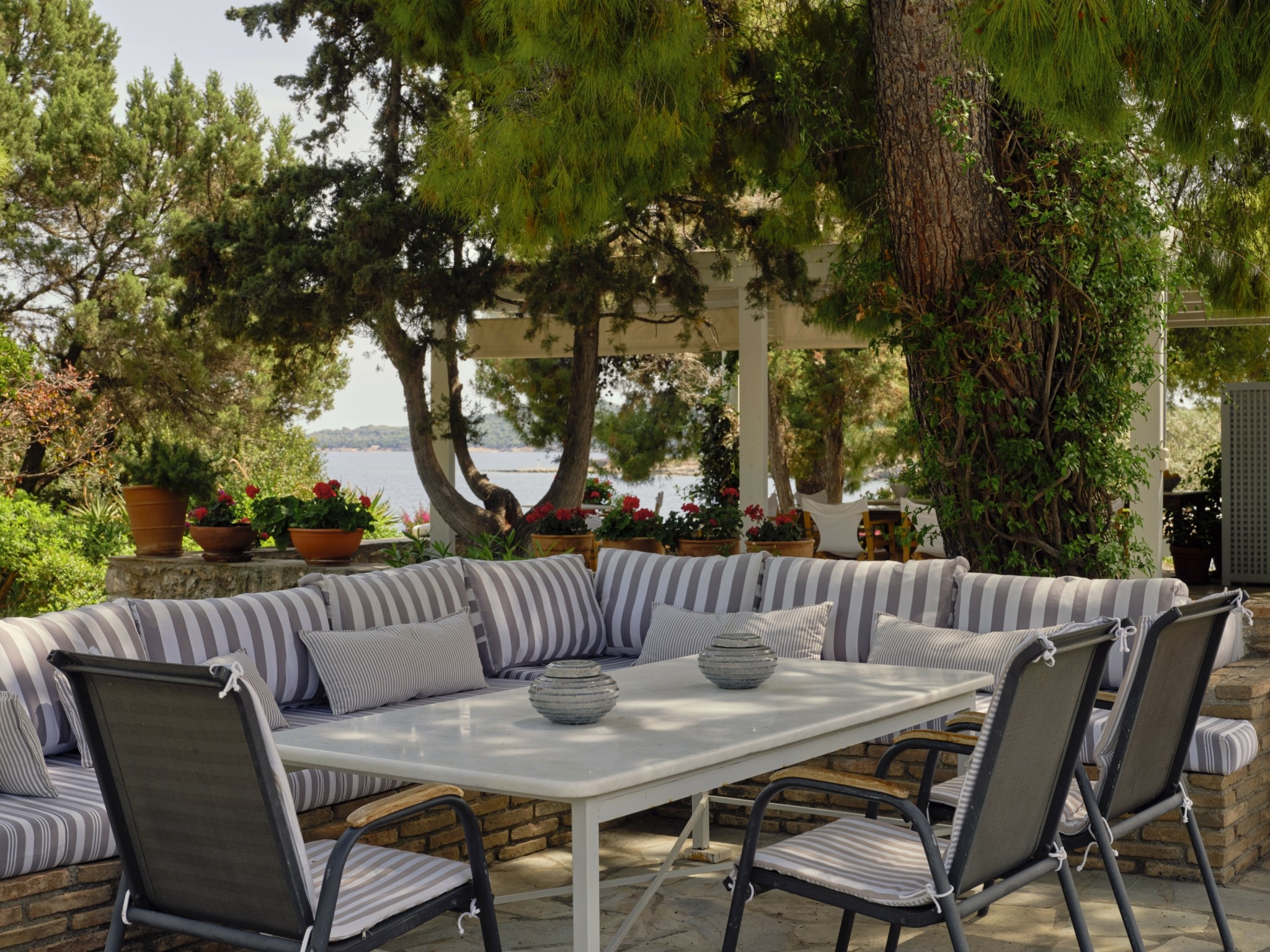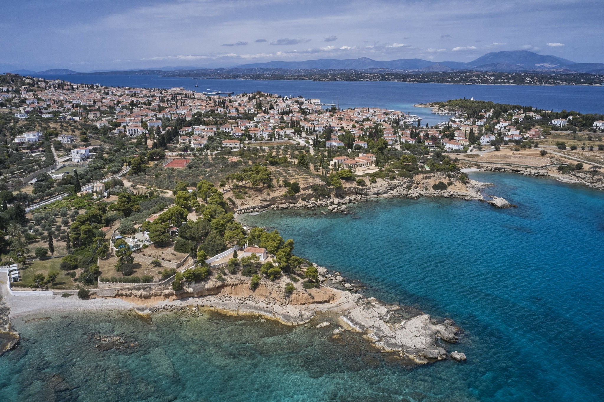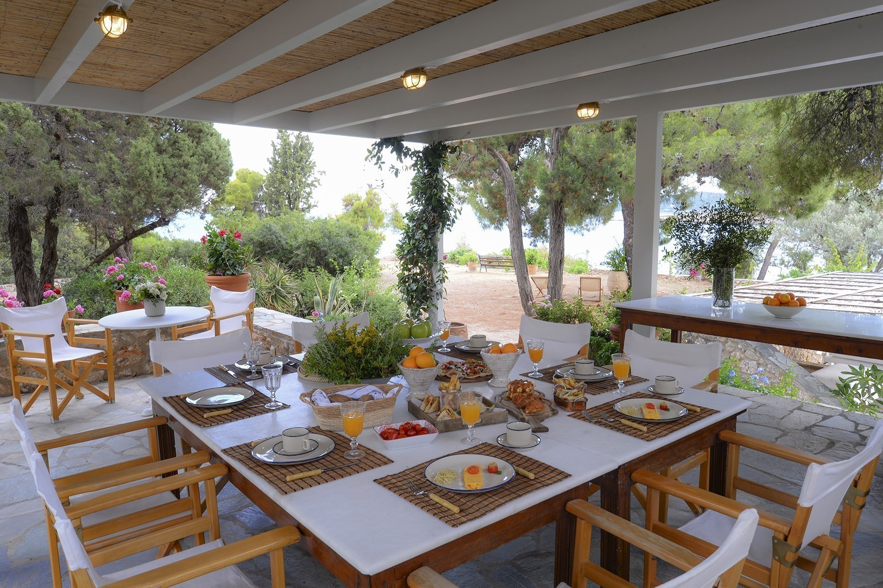 Χτισμένο σε ένα κατάφυτο περιβάλλον, το Pine Estate, όπως ονομάζεται, προσφέρει πανοραμική θέα στα νησάκια των jet setters, Σπετσοπούλας, Τρίκερι και Αγίου Ιωάννη, φτάνοντας μέχρι την Ύδρα. Η πλούσια βλάστηση –από αιωνόβια ελαιόδεντρα, πεύκα και κυπαρίσσια μέχρι αρωματικά φυτά– συνθέτει έναν φυσικό παράδεισο, ενώ τα παιχνιδίσματα του φωτός στο τοπίο προσφέρουν μαγευτικές εικόνες από την αυγή έως το ηλιοβασίλεμα.