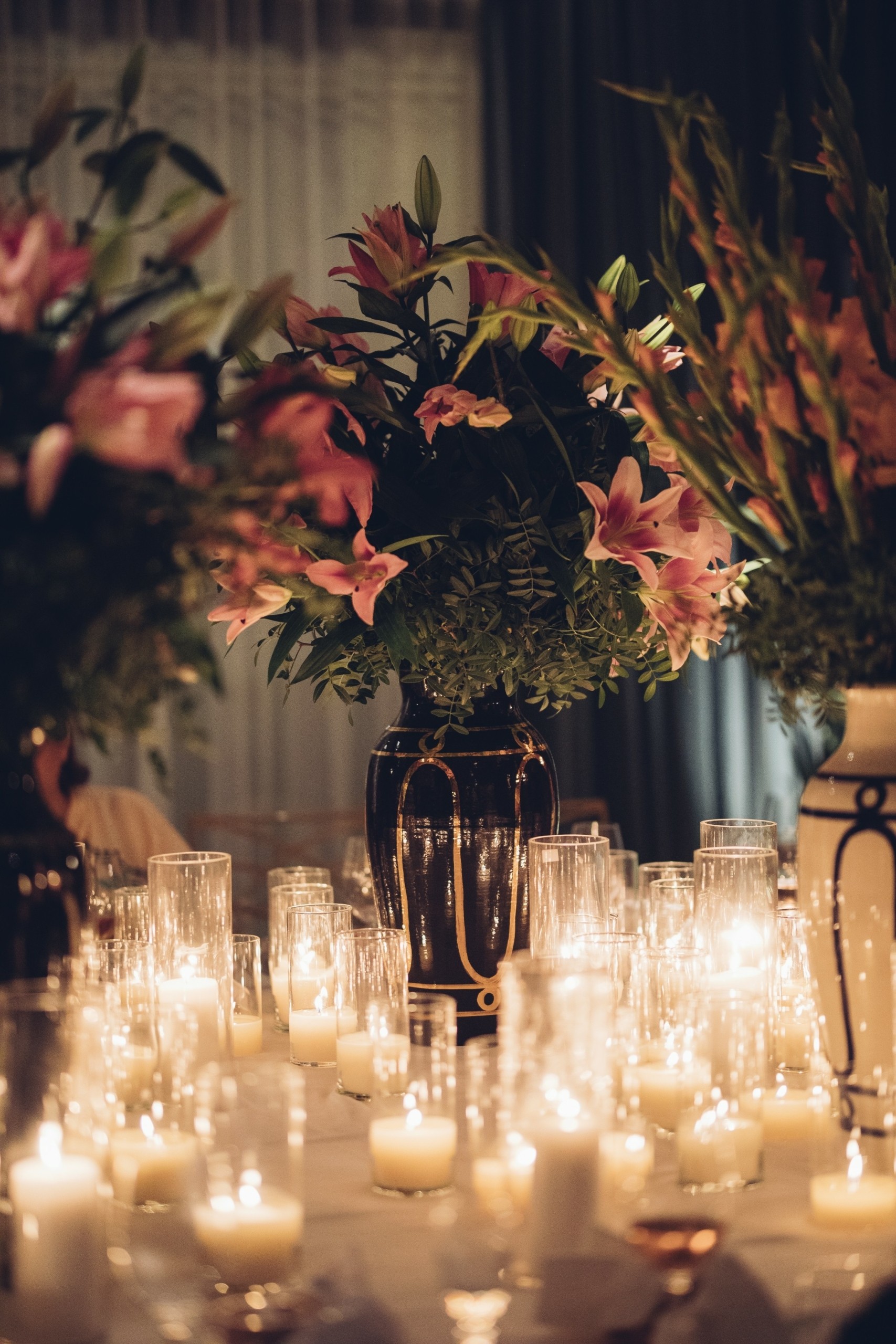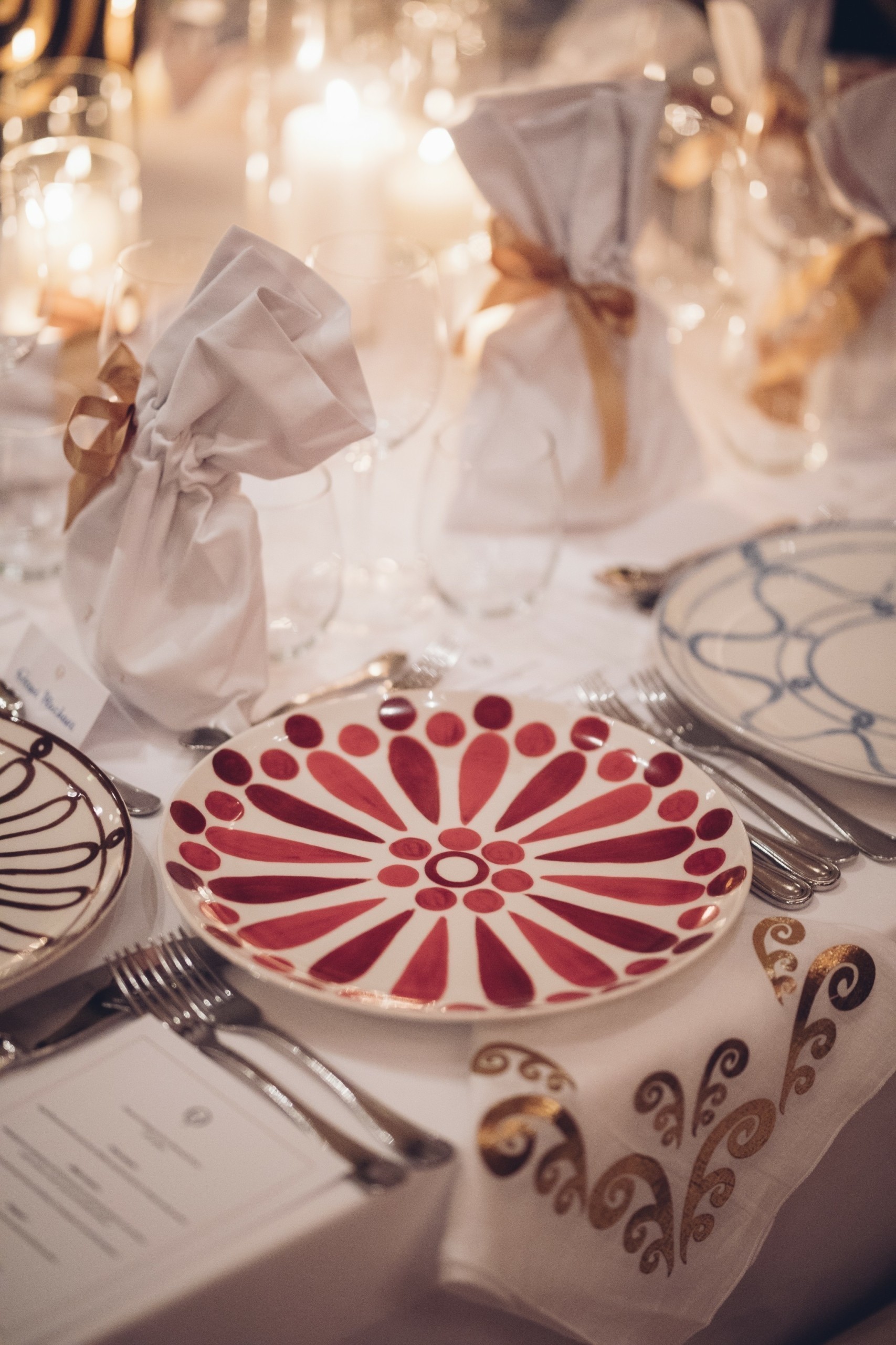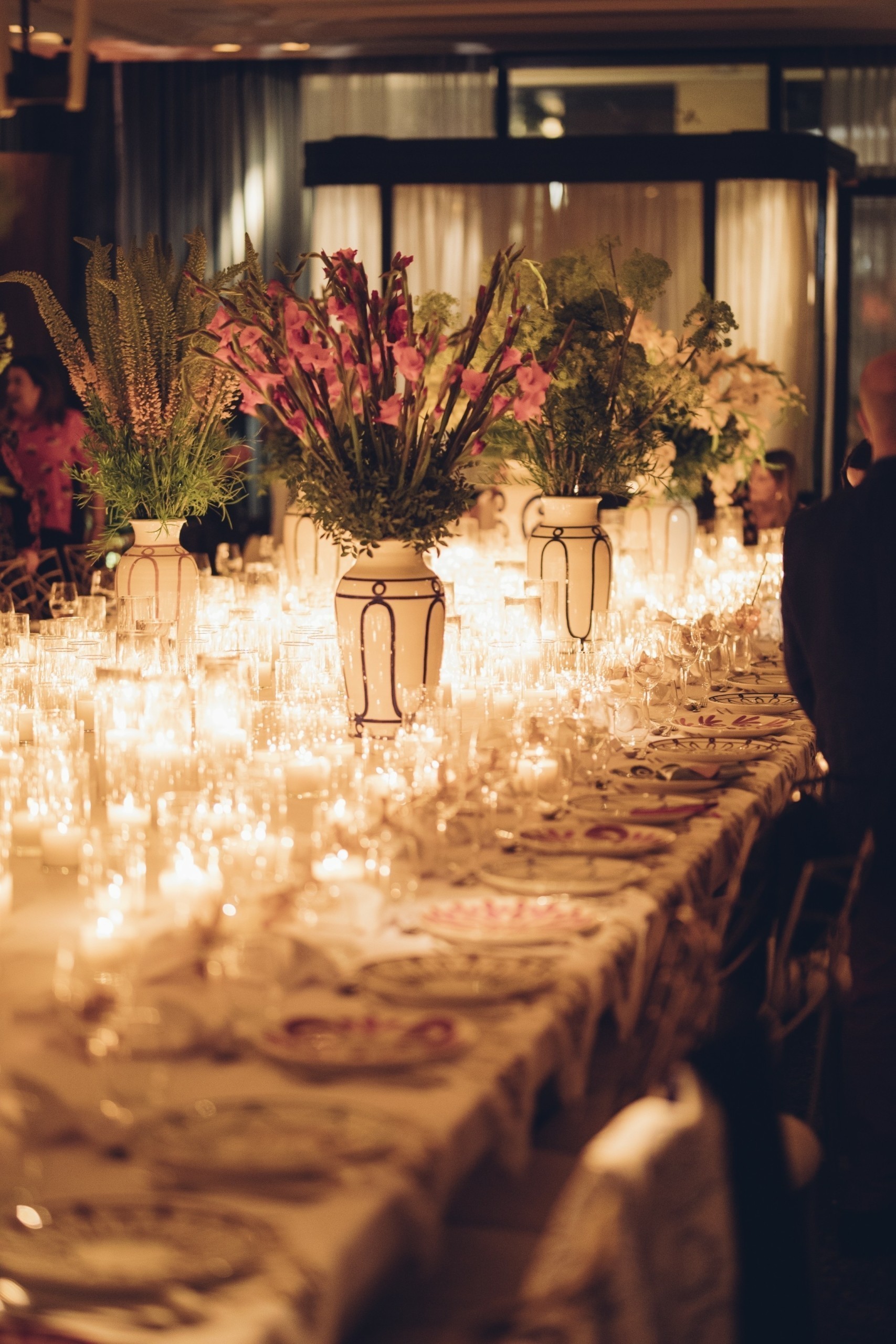 Κάθε καλεσμένος είχε διαφορετικό πιάτο αλλά και πετσέτα τα οποία δημιούργησε ειδικά για την βραδιά. Πάνω στο τραπέζι υπήρχαν ψηλά βάζα του brand της ενώ κυρίαρχο ρόλο στο feeling δημιουργούσαν τα 1200 κεριά.