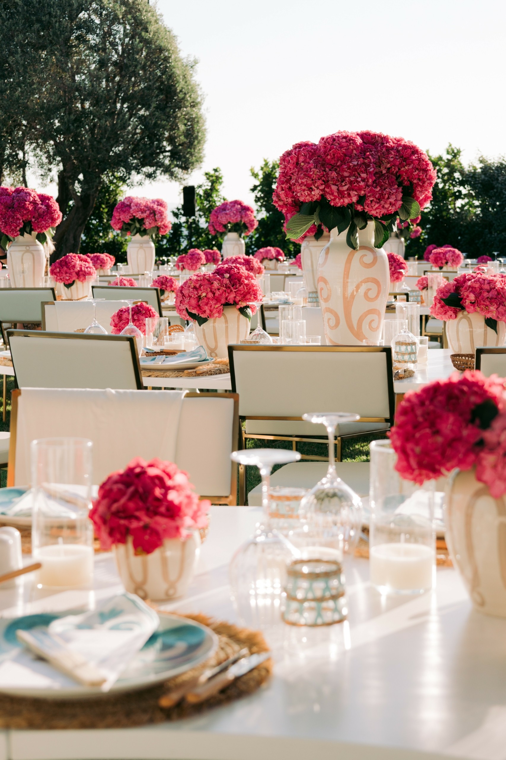 Οι 200 καλεσμένοι μαγεύτηκαν από την ambiance του χώρου, το μοναδικό art de la table και τις δεκάδες ορτανσίες που πρόβαλλαν πάνω στα τραπέζια και έδεναν αρμονικά με ιδιαίτερα ψηλά βάζα και τα Themis Z σερβίτσια.