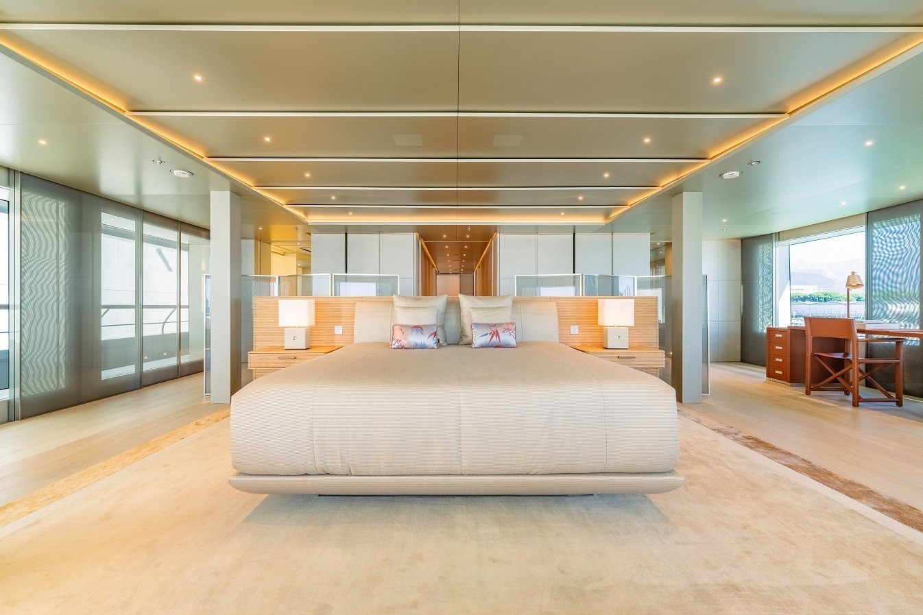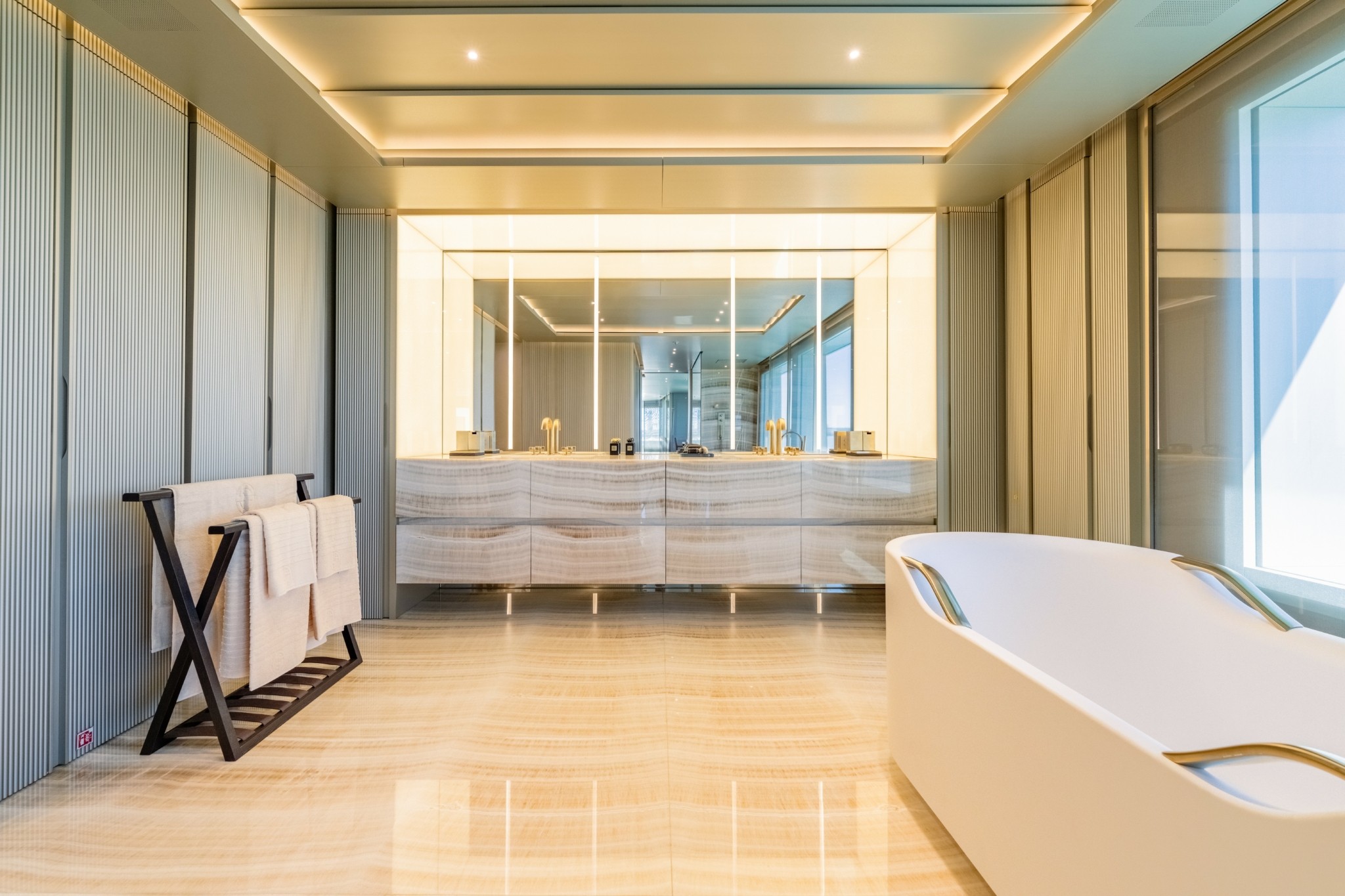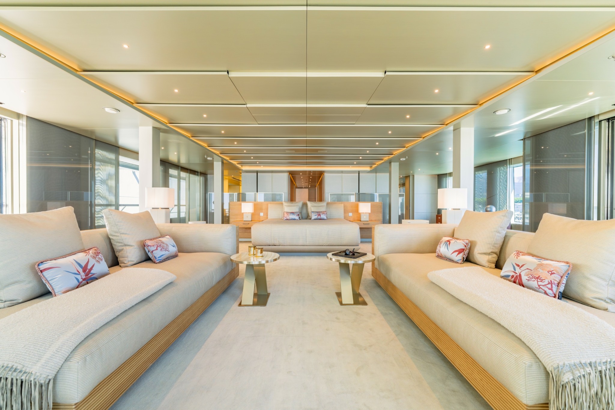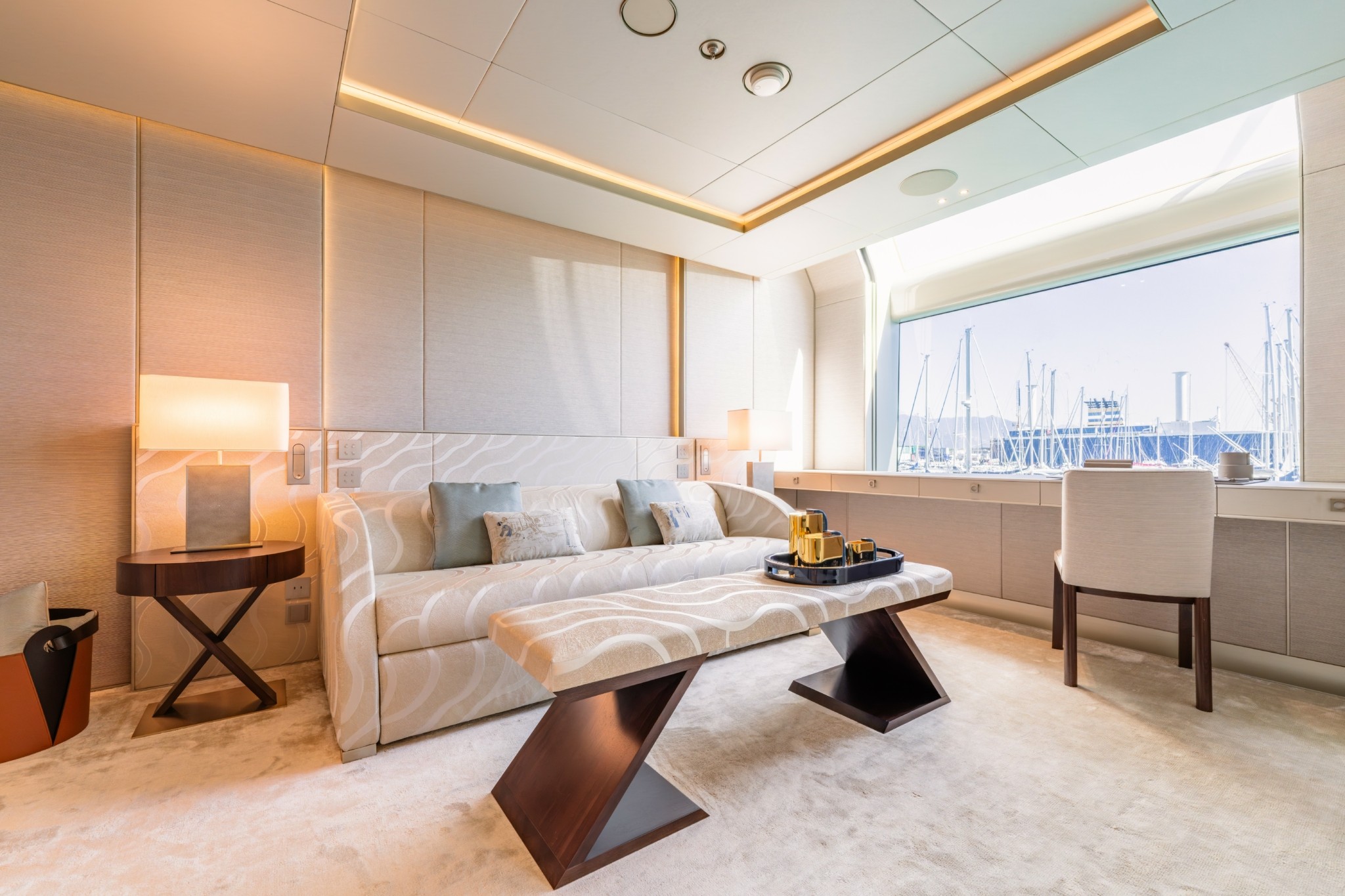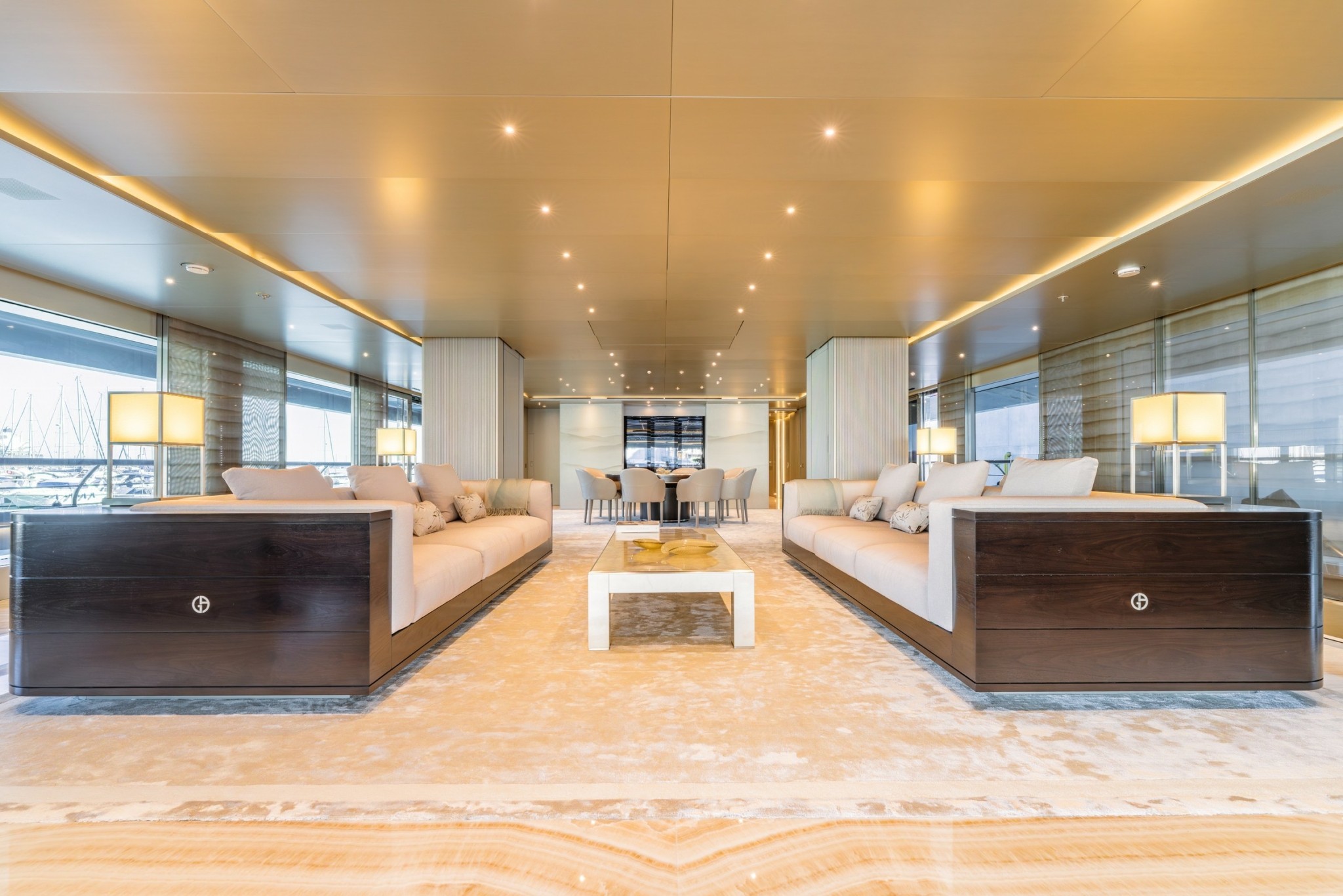 Το σκάφος διαθέτει τα πιο ακριβά μάρμαρα όπως Black Marquinia και Calacatta που δημιουργούν μεταξύ τους αντιθέσεις. Επιπλέον, η καρυδιά Canaletto πρωταγωνιστεί, όπως και οι καθρέφτες, τα πρωτότυπα γλυπτά και ο χαλαρωτικός φωτισμός που συμβάλλει σε ζεν σκηνικό.