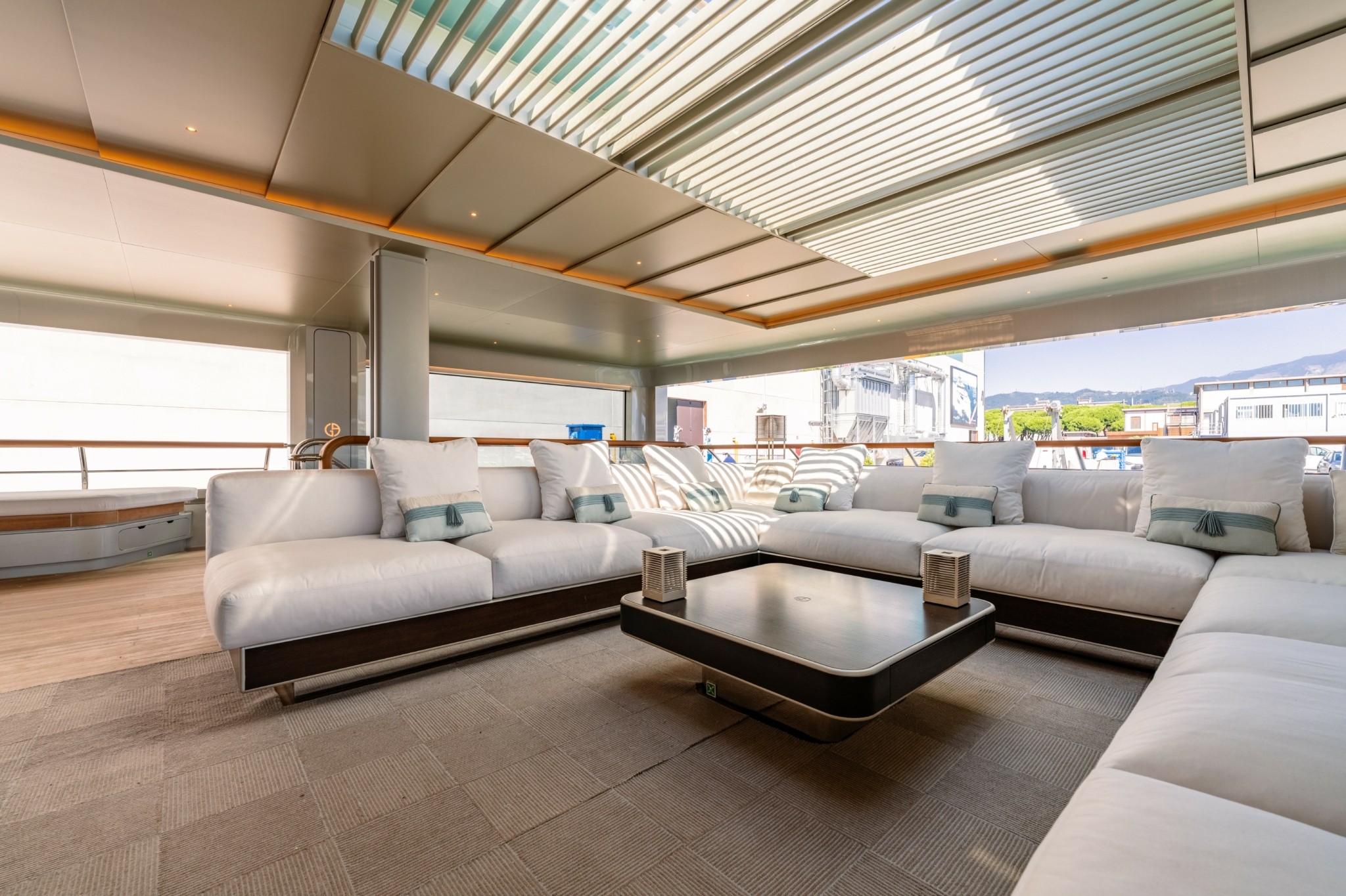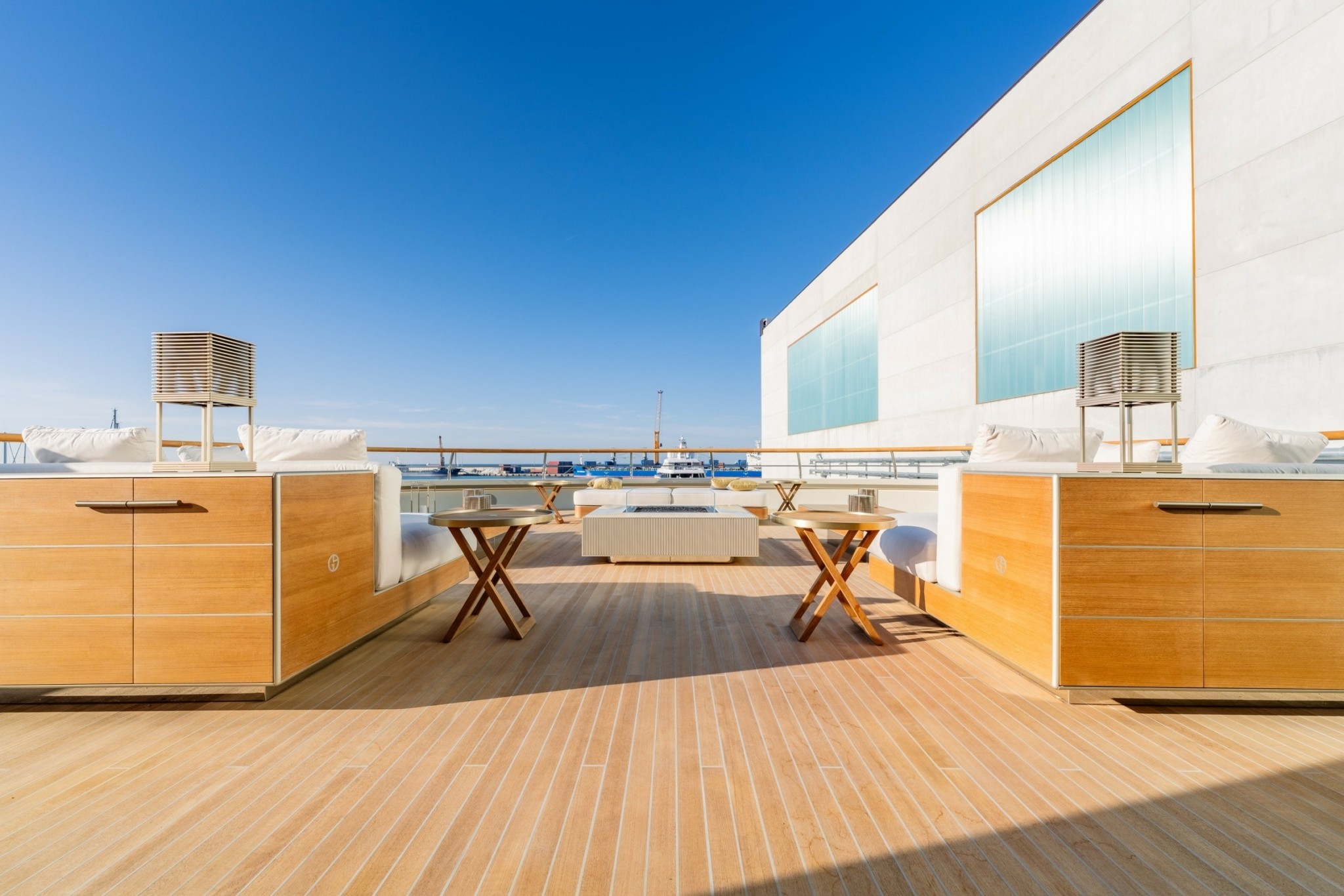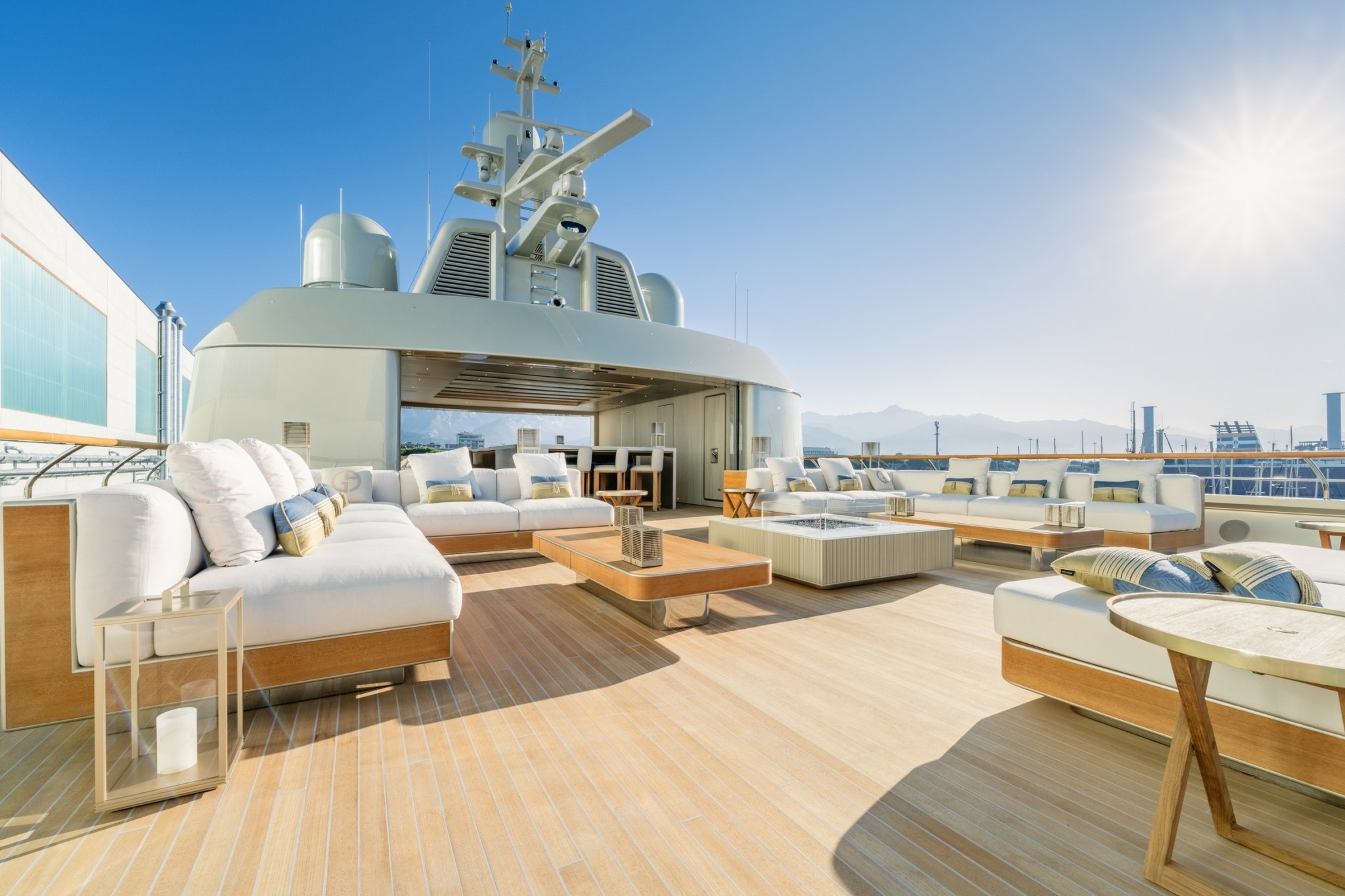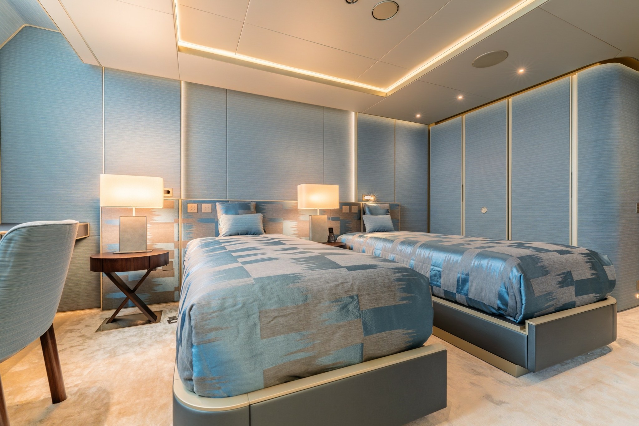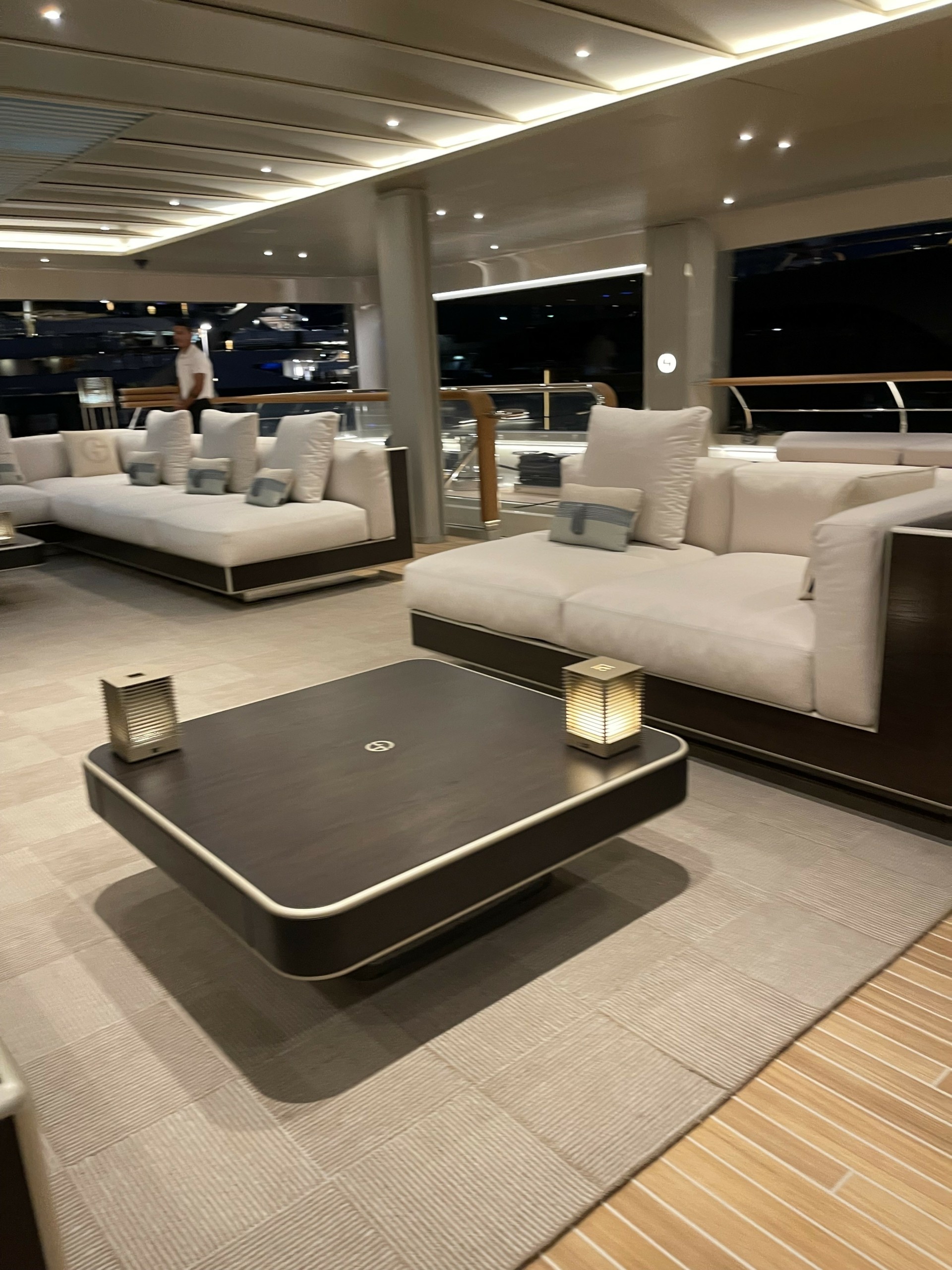 Το σκάφος διαθέτει τα πιο ακριβά μάρμαρα όπως Black Marquinia και Calacatta που δημιουργούν μεταξύ τους αντιθέσεις. Επιπλέον, η καρυδιά Canaletto πρωταγωνιστεί, όπως και οι καθρέφτες, τα πρωτότυπα γλυπτά και ο χαλαρωτικός φωτισμός που συμβάλλει σε ζεν σκηνικό.