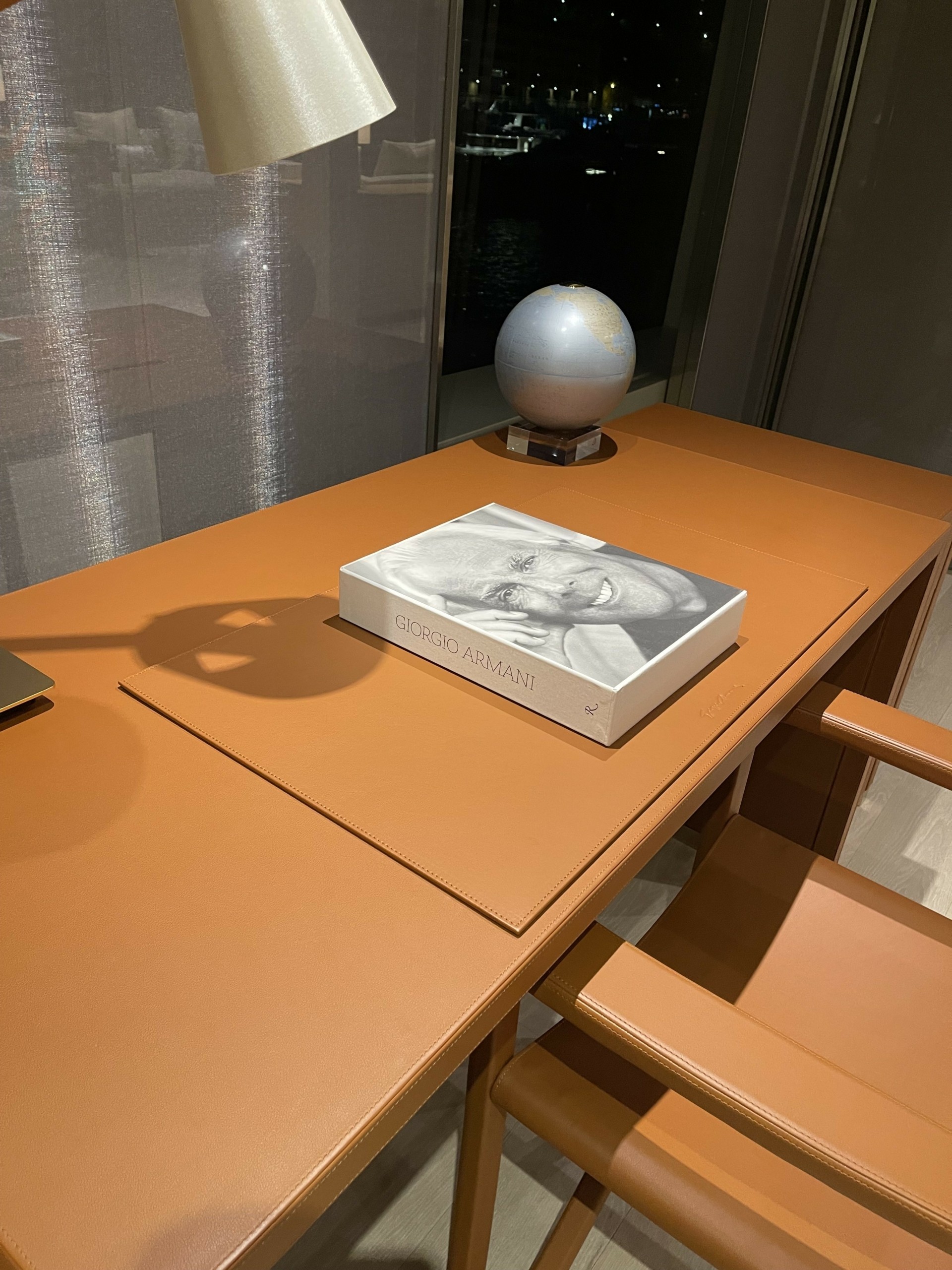 H τραπεζαρία από σπάνιο ξύλο με απίστευτο φινίρισμα βρίσκεται σε απόσταση επαφής από τον φίνο χώρο για τα κρασιά ενώ για διασκέδαση και πάρτι υπάρχει και το deck με το open bar. Πισίνες υπερχείλισης, δύο τζάκια και το beach club είναι details που κερδίζουν την προσοχή. Οι ταπετσαρίες και τα υφάσματα είναι σε τόνους μπεζ-γκρι που λάτρευε ο Ιταλός βασιλιάς της μόδας. Τα έπιπλα είναι όλα Armani Casa και μάλιστα custom made ενώ παντού υπάρχουν τα εμβληματικά initial του οίκου με το G.A. αλλά και coffee table books που αφορούν τη ζωή και την ενδιαφέρουσα διαδρομή του.
