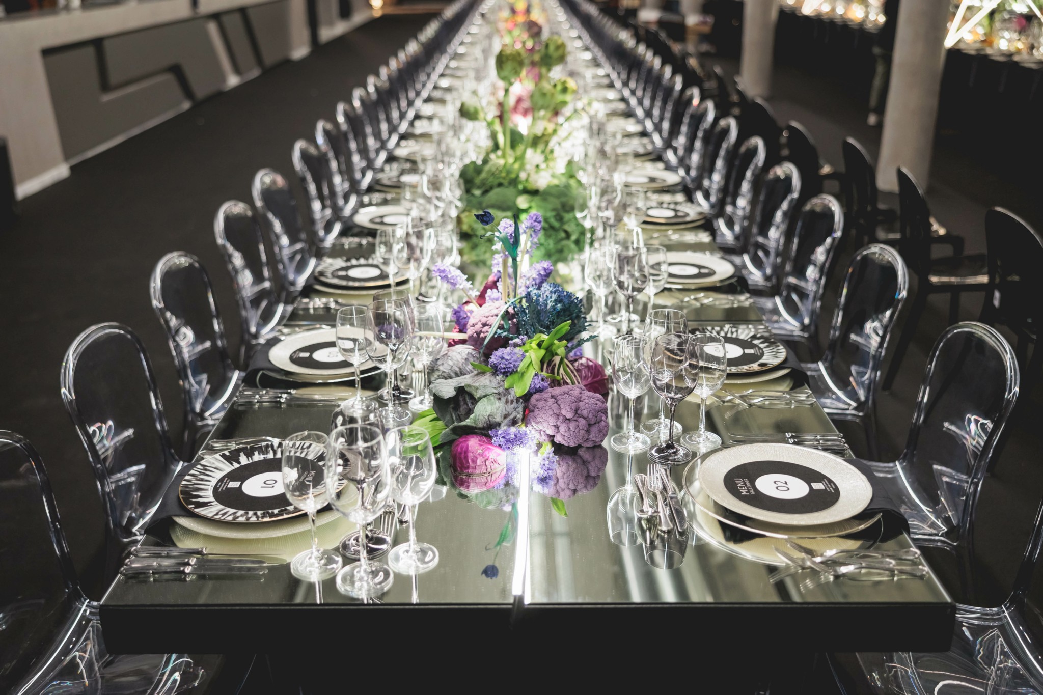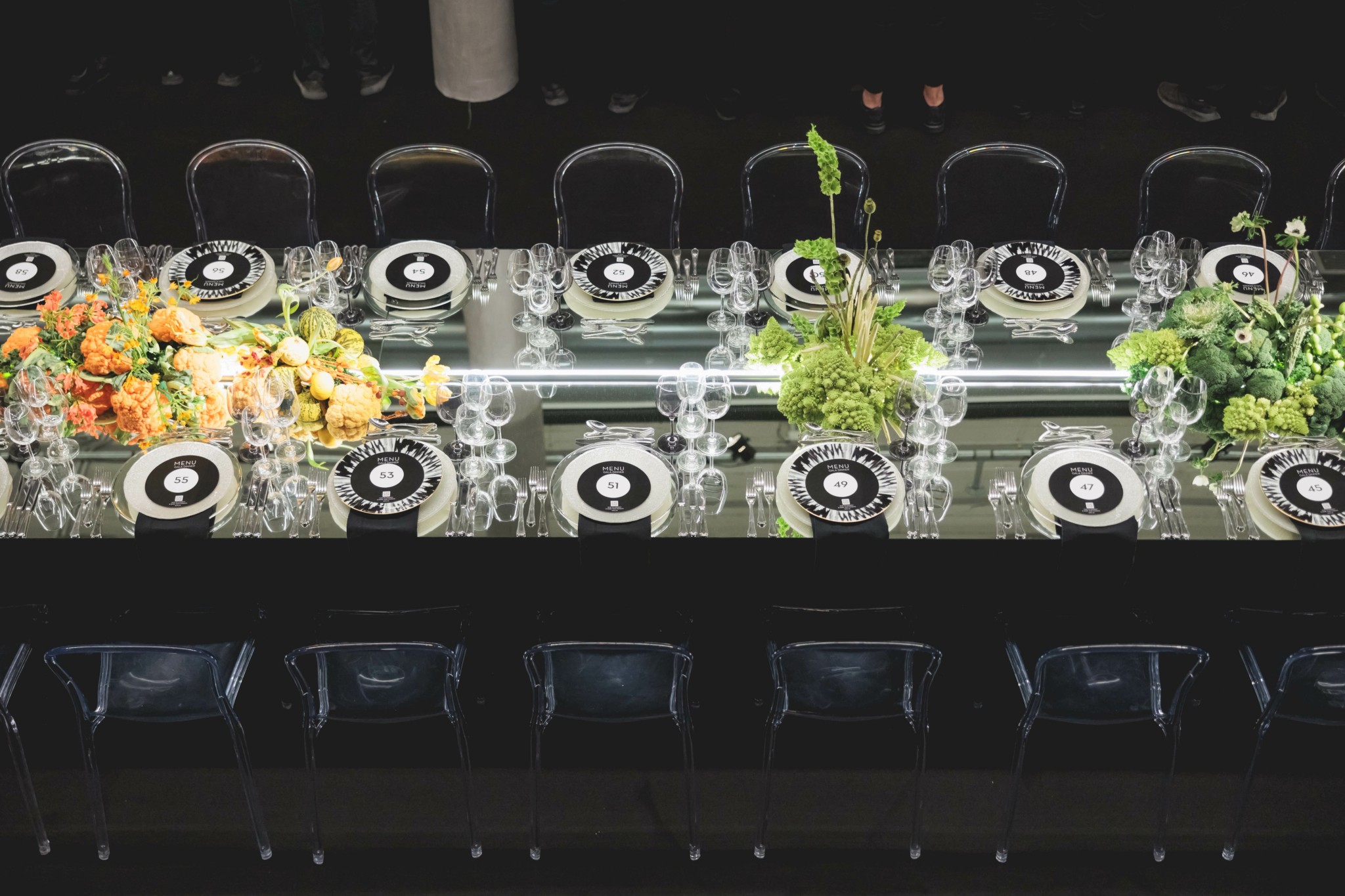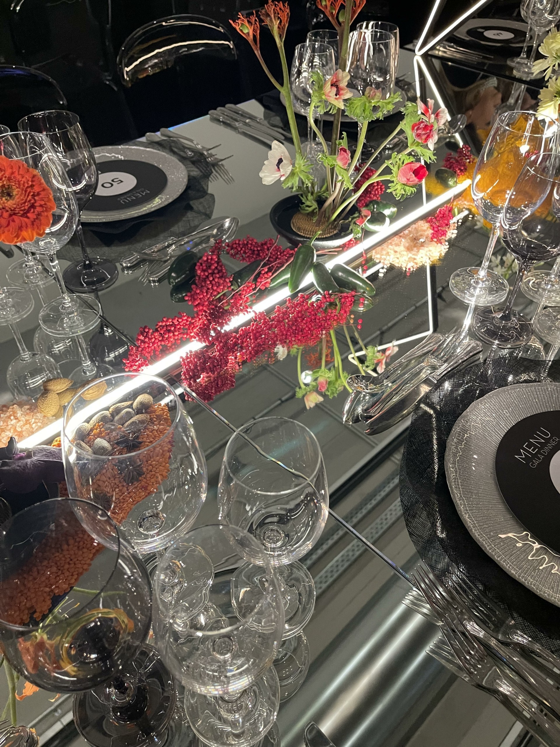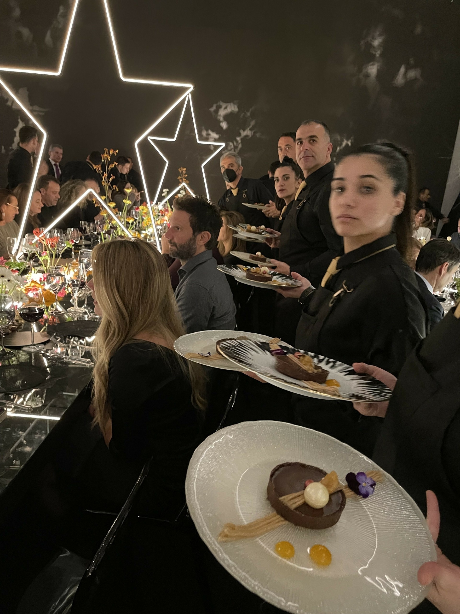 Τραπέζια των 100 ατόμων ντυμένα με καθρέφτες σε ένα setup που έκοβε την ανάσα και επιμελήθηκε η Βανέσα Σουραβλιά. Πορσελάνινα σερβίτσια, κρυστάλλινα ποτήρια και ένα art de la table χρώματα σε συνδυασμό λουλουδιών με μπαχαρικά και θησαυρούς από τη γη.