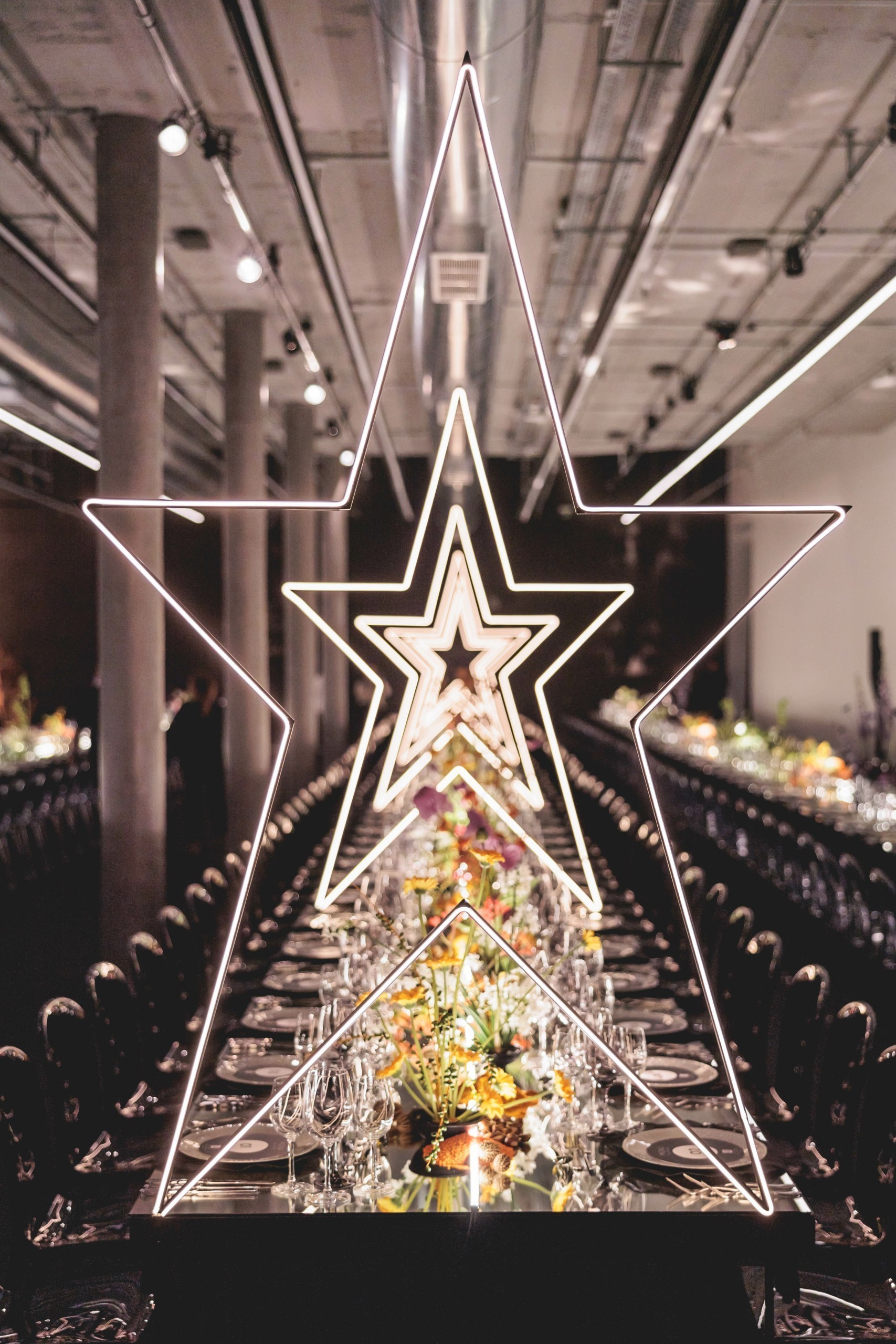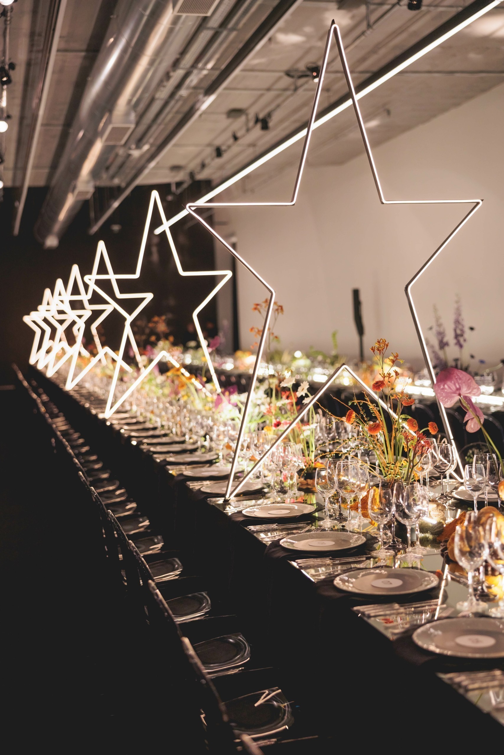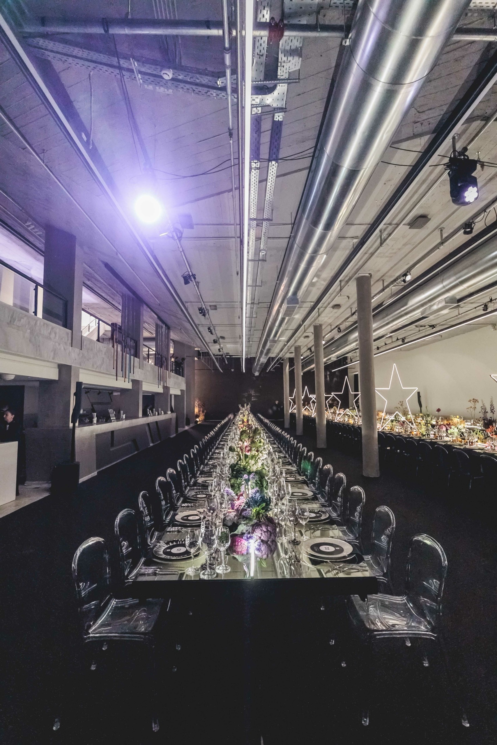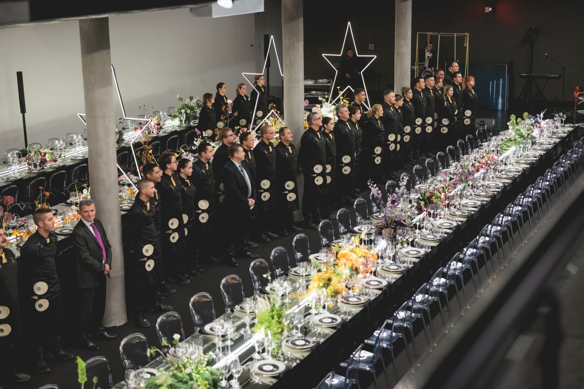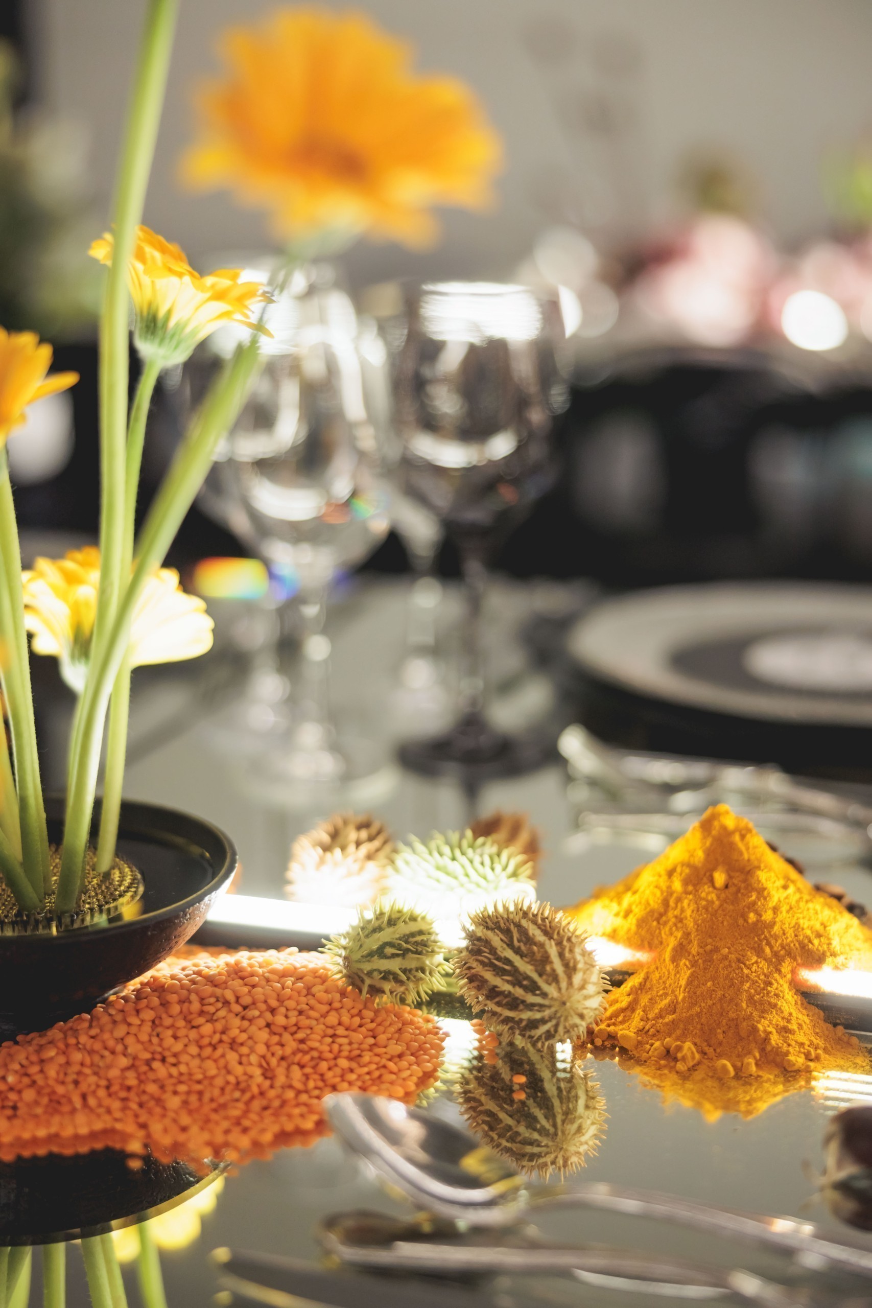 Τραπέζια των 100 ατόμων ντυμένα με καθρέφτες σε ένα setup που έκοβε την ανάσα και επιμελήθηκε η Βανέσα Σουραβλιά. Πορσελάνινα σερβίτσια, κρυστάλλινα ποτήρια και ένα art de la table χρώματα σε συνδυασμό λουλουδιών με μπαχαρικά και θησαυρούς από τη γη.