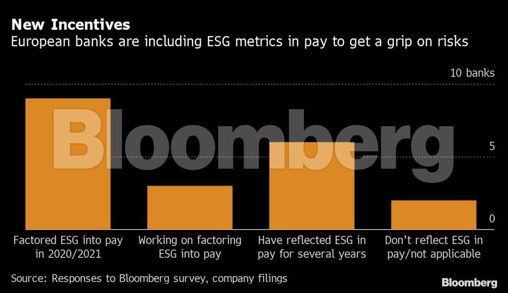 Η πλειοψηφία των μεγαλύτερων ευρωπαϊκών τραπεζών δήλωσε ότι είτε διαθέτει ήδη είτε εργάζεται προκειμένου να αποκτήσει ένα εταιρικό μοντέλο – πρόγραμμα που να συνδέει τις αμοιβές των εργαζομένων και τις επιδόσεις της εταιρείας με τα κριτήρια βιωσιμότητας ESG. Παρά την απουσία μια κοινής πολιτικής, ολοένα και περισσότερες τράπεζες αναφέρουν ότι ο τρόπος με τον οποίο καθορίζουν τις αμοιβές των εργαζομένων τους εξαρτάται πλέον σε μεγάλο βαθμό από τους στόχους της ESG.