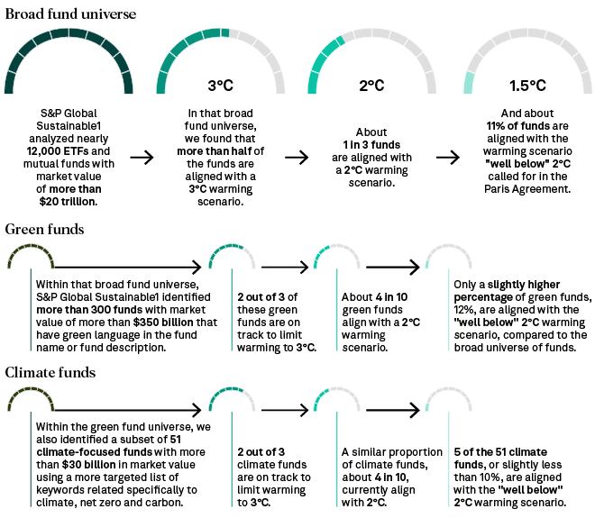 Η εικόνα είναι καλύτερη για τα «πράσινα ταμεία»: το 39% των πράσινων funds βρίσκεται σε καλό δρόμο για να ανταποκριθεί στο φιλόδοξο σενάριο για μείωση της θερμοκρασίας κατά 2°C.