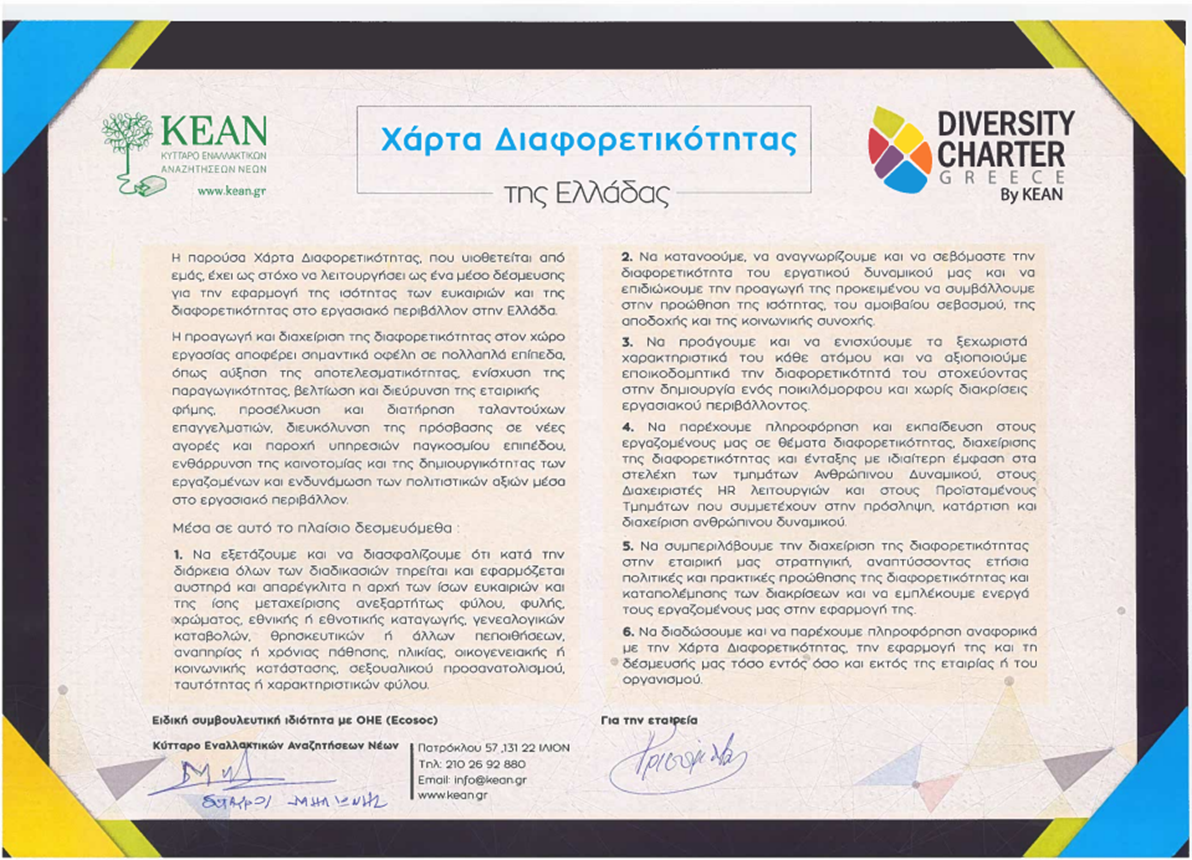 Η Χάρτα Διαφορετικότητας, μια πρωτοβουλία της Ευρωπαϊκής Επιτροπής για την προώθηση της διαφορετικότητας στις επιχειρήσεις, θεσπίστηκε στην Ελλάδα το 2019. Η Ελλάδα έγινε η 23η χώρα που υπέγραψε τον Χάρτη. Στόχος του είναι να λειτουργήσει ως μέσο δέσμευσης για την εφαρμογή της ισότητας, των ίσων ευκαιριών και της διαφορετικότητας σε κάθε εργασιακό περιβάλλον στην Ελλάδα. Στη χώρα μας, η Χάρτα Διαφορετικότητας υλοποιείται από την ΚΕΑΝ σε συνεργασία με το Ινστιτούτο Διαφορετικότητας και Συμπερίληψης-D & I.