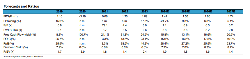 Η Euroxx προβλέπει ότι η Aegean Airlines θα αυξήσει τα καθαρά κέρδη της το 2025 κατά περίπου 9% σε ετήσια βάση, καθώς οι ανθεκτικές αποδόσεις και το υψηλότερο RASK (έσοδα ανά διαθέσιμες θέσεις) θα αντισταθμίσουν τις πιέσεις στο κόστος (εισαγωγή βιώσιμου αεροπορικού καυσίμου, μείωση των δωρεάν δικαιωμάτων CO2 και διαφορά του κόστους από τη χρησιμοποίηση CEOs έναντι NEOs λόγω του ζητήματος της καθήλωσης του στόλου).