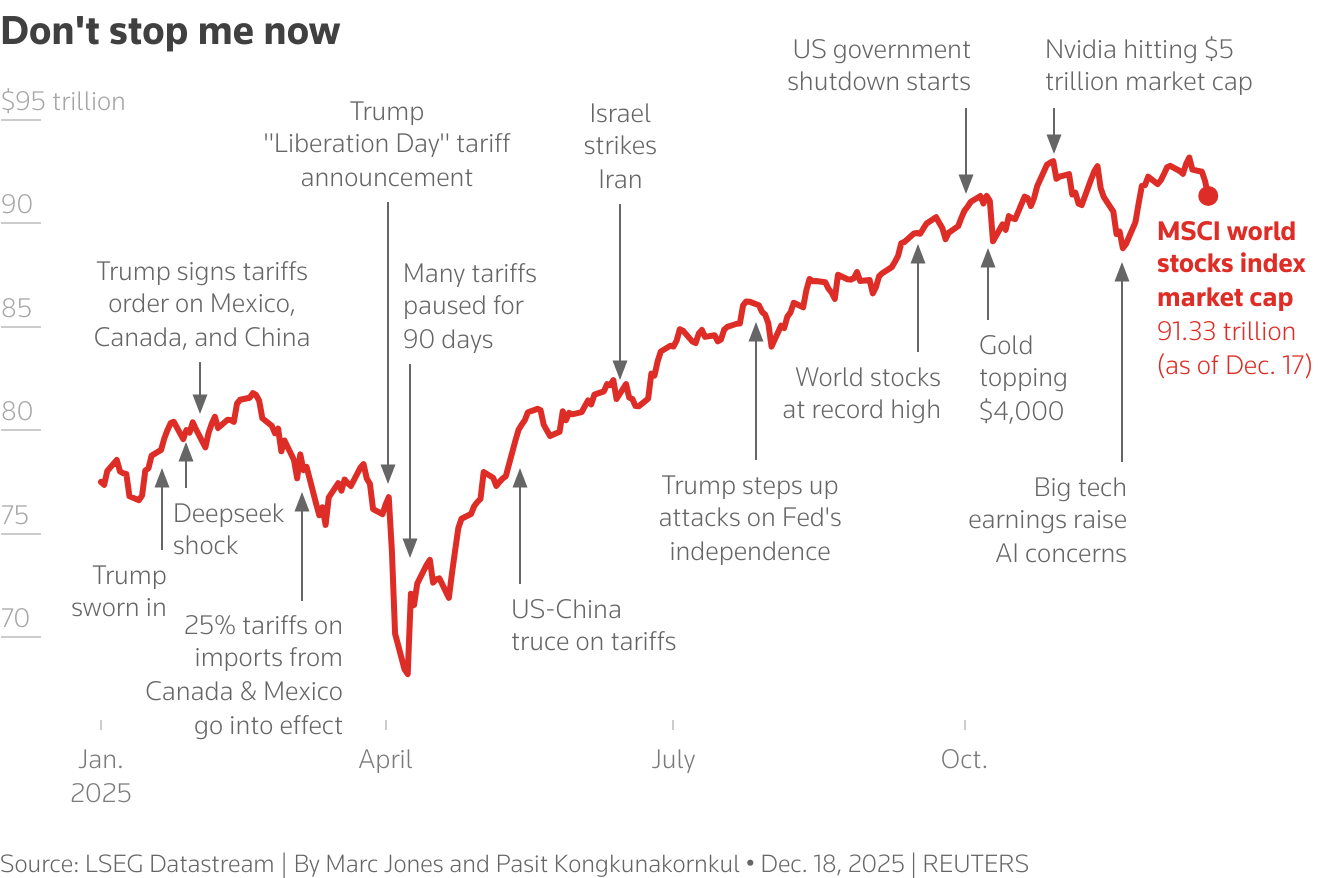 Οι μετοχές παγκοσμίως ανέκαμψαν από την κατάρρευση των τιμών τον Απρίλιο που προκλήθηκε λόγω των δασμών του Τραμπ και σημείωσαν άνοδο 20%, καταγράφοντας το έκτο έτος διψήφιων κερδών τους τα τελευταία επτά χρόνια. Παρά ταύτα, σε άλλες πτυχές της αγοράς, οι εκπλήξεις είναι πολλές.