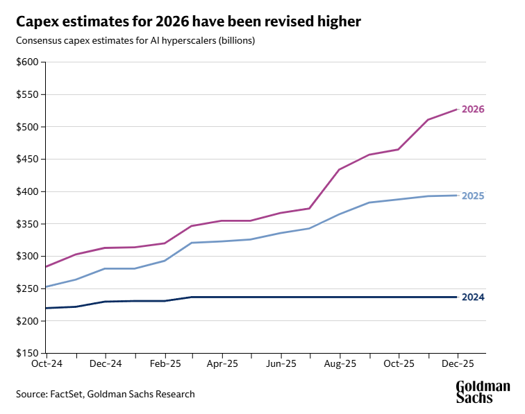 Η τεχνητή νοημοσύνη αποτελεί επίσης μέρος του μείγματος χρέους. Η Goldman Sachs εκτιμά ότι οι mega-caps της τεχνητής νοημοσύνης έχουν δαπανήσει σχεδόν 400 δισεκατομμύρια δολάρια φέτος και θα δαπανήσουν σχεδόν 530 δισεκατομμύρια δολάρια το επόμενο έτος.