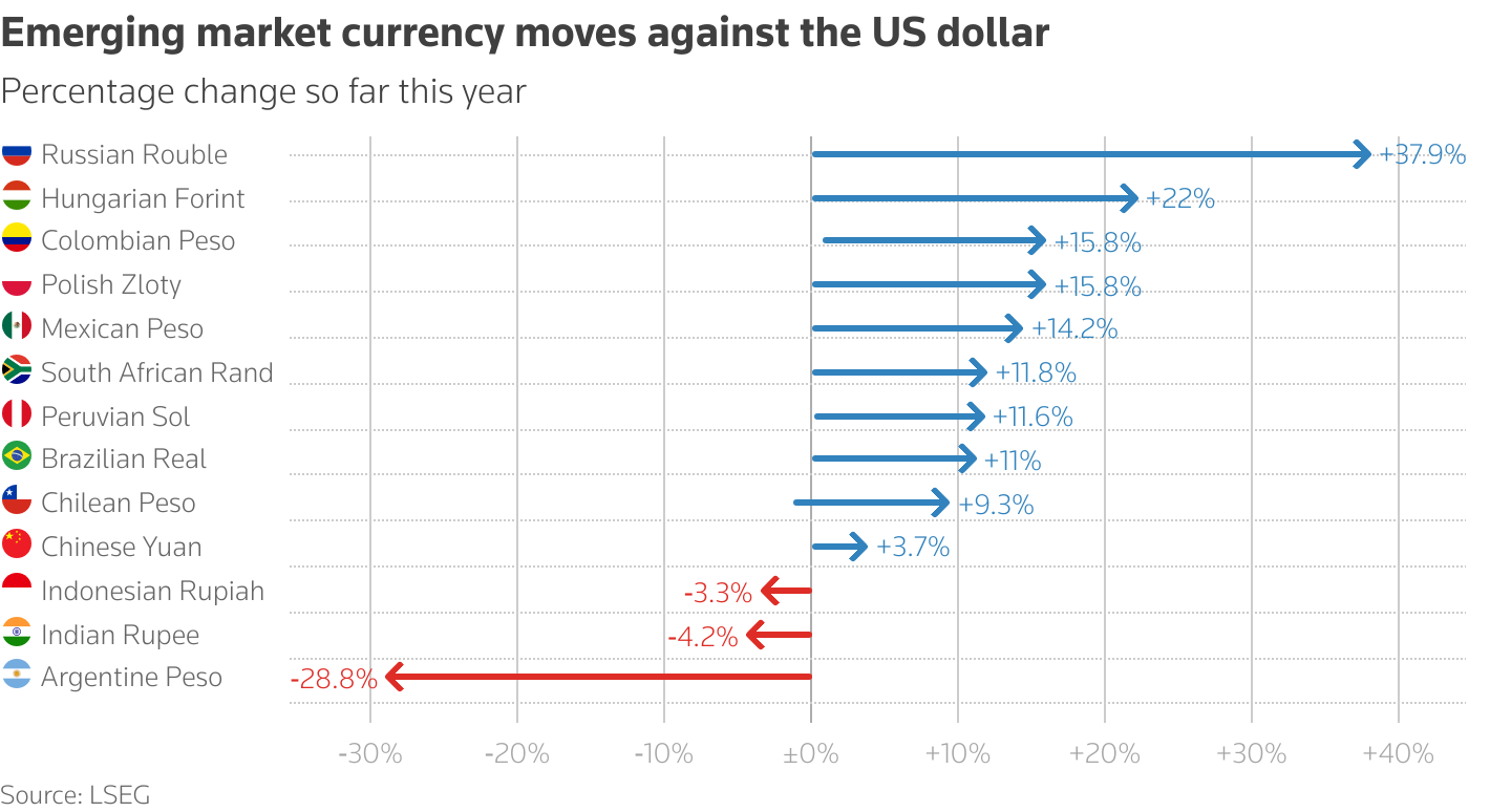 Το ζλότι της Πολωνίας, η τσεχική κορόνα και το ουγγρικό φιορίνι είναι όλα μεταξύ 15% και 20% ισχυρότερα. Το δολάριο της Ταϊβάν σημείωσε άνοδο 8% σε μόλις δύο ημέρες τον Μάιο, ενώ το πέσο του Μεξικού και το πέσο της Βραζιλίας αψήφησαν το δράμα του εμπορικού πολέμου και σημείωσαν διψήφια κέρδη.
