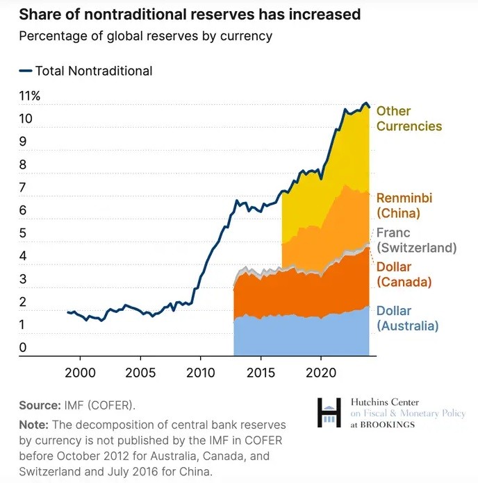 Εν τω μεταξύ, το μερίδιο των μη παραδοσιακών νομισματικών αποθεμάτων έχει αυξηθεί. Νομίσματα όπως το αυστραλιανό δολάριο, το ελβετικό φράγκο και το κινεζικό γουάν αντιπροσώπευαν το 11% όλων των αποθεματικών των κεντρικών τραπεζών στις αρχές του τρέχοντος έτους, από το 2% το 1999, σύμφωνα με τα στοιχεία του ΔΝΤ.