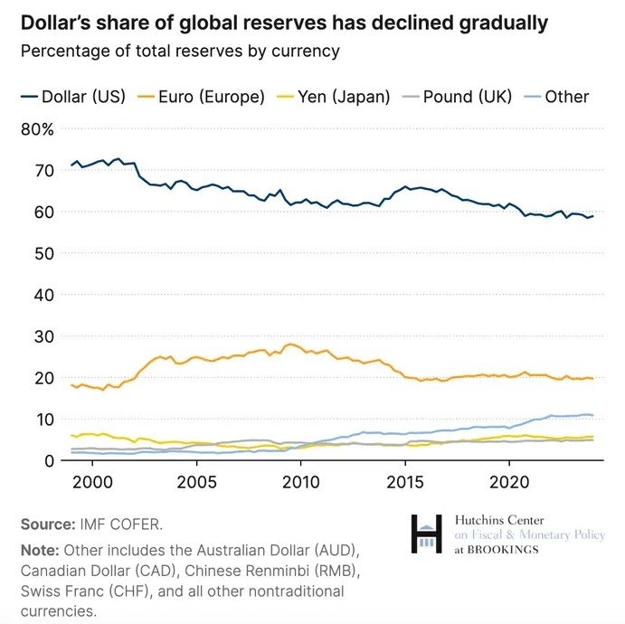 Σε πρόσφατο σημείωμά του, το think tank επεσήμανε τη μεταβαλλόμενη θέση του δολαρίου ΗΠΑ στις παγκόσμιες χρηματοπιστωτικές αγορές, με τη χρήση του δολαρίου να μειώνεται σταθερά τις τελευταίες δεκαετίες. Ενώ το δολάριο εξακολουθεί να κυριαρχεί στα αποθεματικά των κεντρικών τραπεζών και στο παγκόσμιο εμπόριο, το νόμισμα θα αντιπροσωπεύει το 59% όλων των παγκόσμιων αποθεματικών στις αρχές του 2024, από 71% των αποθεματικών το 1999, σύμφωνα με εκτιμήσεις του Διεθνούς Νομισματικού Ταμείου.