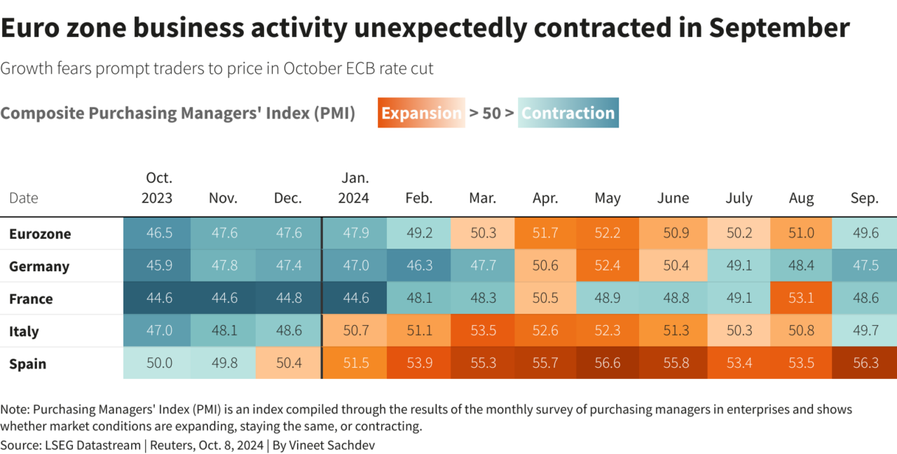 Οι επενδυτές αναμένουν τώρα ότι η Ομοσπονδιακή Τράπεζα των ΗΠΑ θα επιβραδύνει τον ρυθμό μειώσεων των επιτοκίων της μετά από την πρόσφατη μείωση κατά 50 μονάδες βάσης τον Σεπτέμβριο, αλλά η ΕΚΤ αυτή την εβδομάδα αναμένεται να προβεί στην τρίτη μείωση των επιτοκίων της από τον Ιούνιο.