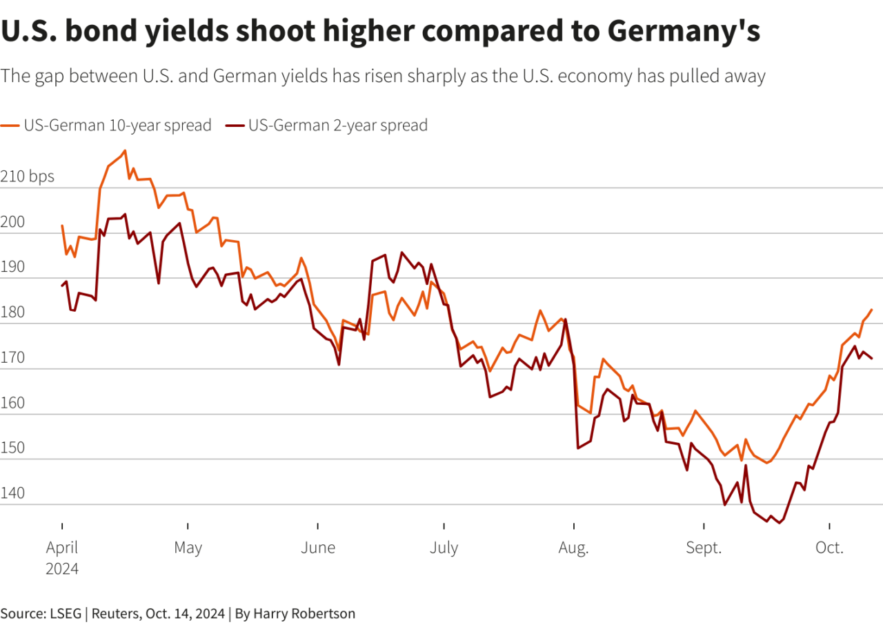 Η στενά παρακολουθούμενη διαφορά μεταξύ των αποδόσεων των αμερικανικών και των γερμανικών 10ετών ομολόγων έχει αυξηθεί στο μεγαλύτερο επίπεδό της από τον Ιούλιο, περίπου στις 183 μονάδες βάσης (bps), καθώς οι αποδόσεις των ομολόγων ΗΠΑ έχουν αυξηθεί σημαντικά τις τελευταίες εβδομάδες, ενώ οι αντίστοιχες των γερμανικών έχουν αυξηθεί ελάχιστα. Οι αποδόσεις κινούνται αντιστρόφως ανάλογα με τις τιμές.