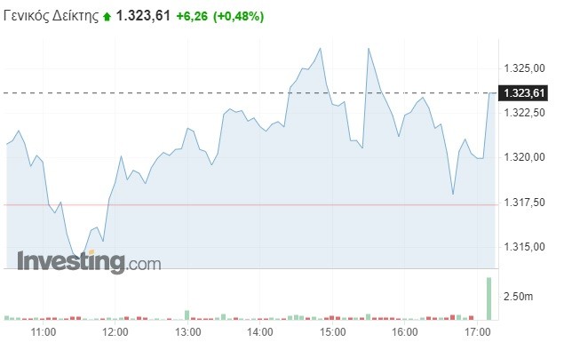 Πιο αναλυτικά, ο Γενικός Δείκτης σημείωσε «ψύχραιμη» άνοδο κατά 0,48% και διαμορφώθηκε στις 1.323,61 μονάδες, κερδίζοντας περίπου 6,5 μονάδες σε σχέση με το κλείσιμο της Τρίτης (1.317,35 μονάδες). Το τόξο των ημερήσιων διακυμάνσεων καθορίστηκε σε 13 μονάδες (από 1.313,81 έως 1.326,20 μονάδες), με τον τζίρο των συναλλαγών να κυμαίνεται στα 106,8 εκατ. ευρώ.