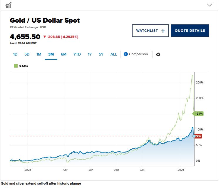 Η τιμή spot του χρυσού υποχώρησε περίπου 5% στα 4.611,4 δολάρια ανά ουγγιά, μετά την πτώση σχεδόν 10% της Παρασκευής, όταν οι τιμές κατρακύλησαν κάτω από τα 5.000 δολάρια. Το ασήμι, που είχε εκτιναχθεί μαζί με τον χρυσό λόγω ζήτησης ασφαλούς καταφυγίου και κερδοσκοπικών εισροών, παρέμεινε επίσης υπό ισχυρή πίεση, μετά τη «βουτιά» 30% της Παρασκευής — τη χειρότερη ημερήσια επίδοσή του από τον Μάρτιο του 1980. Οι spot τιμές του ασημιού διαμορφώνονταν χαμηλότερα κατά πάνω από 10%, στα 76,11 δολάρια ανά ουγγιά.
