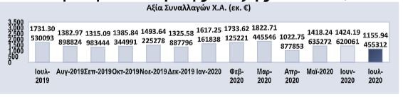 Η Αξία Συναλλαγών του Ιουλίου 2020 έφτασε τα €1.155,94 εκατ. (βλ. γράφημα 1) σημειώνοντας μείωση κατά 18,8% από τη συναλλακτική δραστηριότητα του προηγούμενου μήνα που ήταν €1.424,20 εκατ. Σε σχέση με τον Ιούλιο του 2019 που η αξία συναλλαγών ήταν €1.731,31 εκατ., σημειώθηκε μείωση της τάξης του 33,2%.