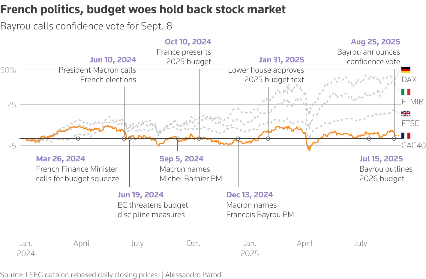Ο Γάλλος πρωθυπουργός Φρανσουά Μπαϊρού αναμένεται να χάσει την ψήφο εμπιστοσύνης στις 8 Σεπτεμβρίου λόγω των σχεδίων της κυβέρνησης για περικοπές στον προϋπολογισμό, γεγονός που επιτείνει τους κινδύνους για τις ευρωπαϊκές μετοχές, τις γαλλικές τράπεζες και τα μακροπρόθεσμα γαλλικά ομόλογα, των οποίων οι αποδόσεις είναι κοντά στα υψηλότερα επίπεδα από το 2011.