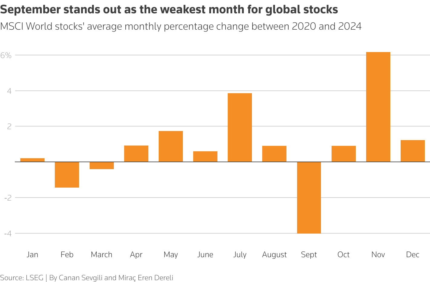 Οι επενδυτές προειδοποιούν ότι τα ρεκόρ των αγορών αντανακλούν εφησυχασμό και αποτελούν λόγο για προσοχή. Ο Σεπτέμβριος είναι ιστορικά ένας αδύναμος μήνας για τις μετοχές. Ο δείκτης MSCI World Index, έχει πέσει κατά μέσο όρο σχεδόν 4% κάθε Σεπτέμβριο από το 2020. Ενώ ο Αύγουστος ήταν ιστορικά ισχυρός για τις αμερικανικές μετοχές, ο Σεπτέμβριος είναι ο μόνος μήνας με αρνητικές μέσες αποδόσεις.