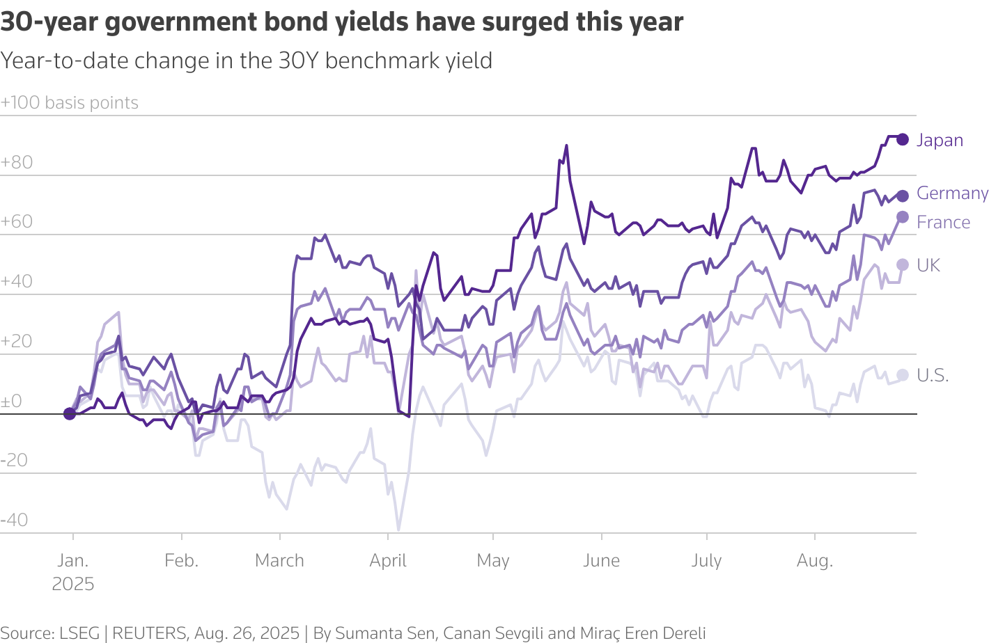 Οι αποδόσεις των 30ετών ομολόγων της Ιαπωνίας, που έχουν αυξηθεί κατά σχεδόν 100 μονάδες βάσης μέχρι στιγμής φέτος, βρίσκονται σε ιστορικά υψηλά επίπεδα, ενώ αυτές στην Ευρώπη είναι κοντά σε πολυετή υψηλά επίπεδα.