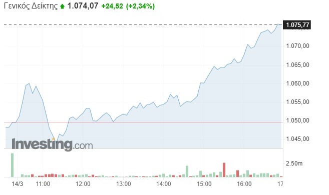 Άνω των 1.070 μονάδων επανήλθε το Χρηματιστήριο Αθηνών, «σβήνοντας» τις απώλειες του προηγούμενου διημέρου και απαλείφοντας την όποια επίπτωση από την κατάρρευση της Silicon Valley Bank. Άλλωστε, η βελτίωση του κλίματος στο εξωτερικό, ιδίως μετά τα στοιχεία για τον αμερικανικό πληθωρισμό, συνέδραμε τα μέγιστα στην άρση της επιφυλακτικότητας.