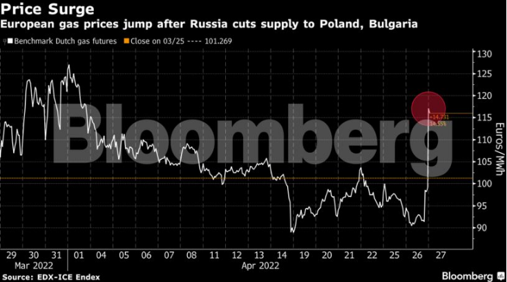 Όπως αναφέρει το Bloomberg, η Ρωσία είναι ο μεγαλύτερος προμηθευτής φυσικού αερίου της Ευρώπης και η κίνηση κατά της Πολωνίας και της Βουλγαρίας ουσιαστικά αφαιρεί από την εργαλειοθήκη της ΕΕ την επιλογή επιβολής κυρώσεων για το φυσικό αέριο. Η διακοπή της ροής από τη Μόσχα υποδηλώνει επίσης τη χρήση της ενέργειας ως «όπλο», καθώς η σύγκρουση ξεπερνά τα σύνορα της Ουκρανίας.