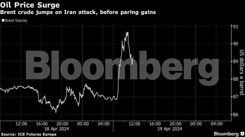 Το αργό τύπου brent διαπραγματευόταν περίπου 2% υψηλότερα, αφού νωρίτερα εκτινάχθηκε πάνω από τα 90 δολάρια το βαρέλι, λόγω των ανησυχιών για το ενδεχόμενο μιας ευρύτερης περιφερειακής σύγκρουσης που θα μπορούσε να θέσει σε κίνδυνο τον εφοδιασμό με αργό. Το Ισραήλ εξαπέλυσε πλήγμα κατά του Ιράν, σύμφωνα με δύο Αμερικανούς αξιωματούχους, αλλά το ημιεπίσημο πρακτορείο ειδήσεων Tasnim της Ισλαμικής Δημοκρατίας διέψευσε τις αναφορές και δήλωσε ότι οι πυρηνικές εγκαταστάσεις του Ισφαχάν είναι ασφαλείς.
