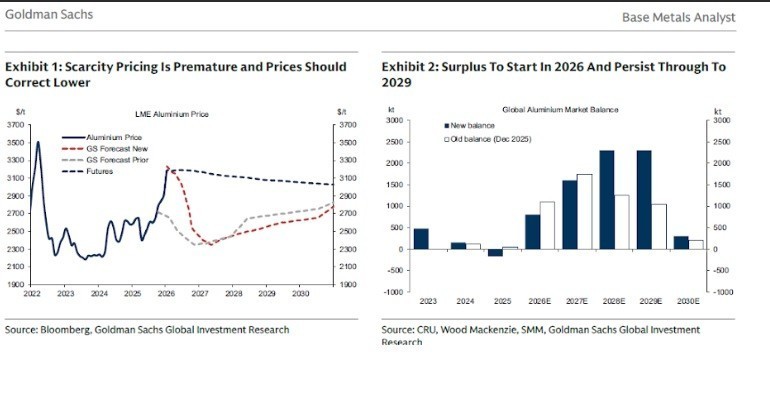 Παρότι το 2025 αναμένεται μικρό έλλειμμα στην αγορά, της τάξης των 173 χιλ. τόνων, η τράπεζα χαρακτηρίζει το ισοζύγιο ουσιαστικά ισορροπημένο για μια αγορά 76 εκατ. τόνων. Το κρίσιμο σημείο είναι τι θα ακολουθήσει: από το 2026 προβλέπεται επιτάχυνση της προσφοράς και ταυτόχρονη επιβράδυνση της ζήτησης. Η Goldman αναμένει πλεόνασμα 0,8 εκατ. τόνων το 2026, 1,6 εκατ. τόνων το 2027 και ακόμη μεγαλύτερα πλεονάσματα προς το τέλος της δεκαετίας. Κατά συνέπεια, εκτιμά ότι οι τιμές δεν μπορούν να διατηρηθούν πάνω από τα 3.000 δολάρια και προβλέπει υποχώρηση προς τα 2.500 δολάρια στο τέλος του 2026 και μέσο όρο 2.400 δολαρίων το 2027.