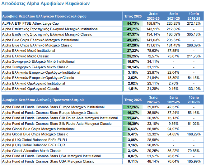Το 2025 καταγράφηκαν υψηλές εισροές στα ελληνικά μετοχικά και μικτά αμοιβαία κεφάλαια της Εταιρείας, καθώς και διψήφιες αποδόσεις σε μεγάλο μέρος των προϊόντων αυτών, επιβραβεύοντας την εμπιστοσύνη των επενδυτών στην Alpha Asset Management.