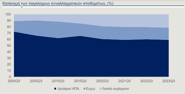 Παρά το γεγονός ότι το μερίδιο του δολαρίου στα συναλλαγματικά αποθέματα των κεντρικών τραπεζών παγκοσμίως έχει μειωθεί διαχρονικά, εξακολουθεί να είναι κυρίαρχο. Οι πρόσφατες εξελίξεις και οι λόγοι που αναφέρθηκαν για να εξηγήσουν την τάση απο-δολαριοποίησης, δεν υποδηλώνουν επικείμενη απώλεια της κυριαρχίας του δολαρίου ΗΠΑ. Τούτο διότι κανένα εναλλακτικό νόμισμα δεν πληροί τα κριτήρια, επί του παρόντος, ώστε να πάρει τη θέση του ως αποθεματικό νόμισμα. Ωστόσο, λόγω της αυξανόμενης αναγνώρισης των οικονομικών και γεωπολιτικών κινδύνων η τάση προς περαιτέρω απο-δολαριοποίηση φαίνεται αναπόφευκτη. Σε αυτό το πλαίσιο, άλλα νομίσματα, όπως το ευρώ, μπορούν να επωφεληθούν από τη διαφοροποίηση που μπορεί να επιδιώξουν οι διαχειριστές συναλλαγματικών αποθεμάτων, ώστε να αυξήσουν την κατανομή των νομισμάτων τους σε ευρώ (Global Public Investor 2023, OMFIF).