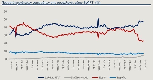 Πρώτον, ο ανταγωνισμός των ΗΠΑ με την Κίνα και οι επιπτώσεις από τον πόλεμο στην Ουκρανία έχουν πυροδοτήσει συζητήσεις για διαφοροποίηση από το δολάριο. Οι ΗΠΑ, η Ευρώπη και άλλες χώρες «πάγωσαν», περίπου, 300 δισ. δολάρια ρωσικών περιουσιακών στοιχείων μετά από την εισβολή της Ρωσίας στην Ουκρανία. Μετά από την επιβολή κυρώσεων στην Ρωσία έχουν αυξηθεί οι ανησυχίες ότι οι ΗΠΑ χρησιμοποιούν την παγκόσμια κυριαρχία του δολαρίου, ώστε να πετύχουν τους στόχους της εξωτερικής πολιτικής τους. Εκτός από την Ρωσία, οι ΗΠΑ έχουν επιβάλει κυρώσεις σε 40 χώρες, περίπου. Επίσης, το δολάριο κυριαρχεί στις συναλλαγές μέσω του διεθνούς διατραπεζικού συστήματος Swift (Γράφημα 2), με το ευρώ να έχει απωλέσει δυνάμεις, ενώ η Κίνα προωθεί το δικό της διεθνές διατραπεζικό σύστημα.