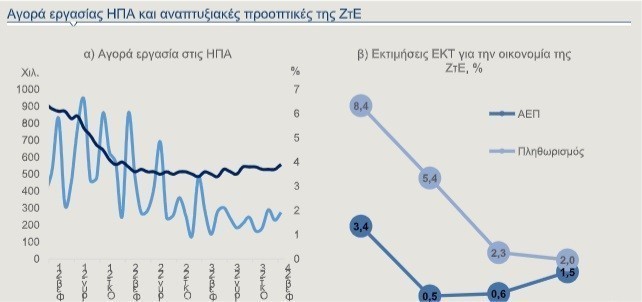 H Ευρωπαϊκή Κεντρική Τράπεζα (ΕΚΤ), στην τελευταία της συνεδρίαση, αποφάσισε να διατηρήσει αμετάβλητα τα βασικά της επιτόκια. Σύμφωνα με τις τελευταίες προβλέψεις της ΕΚΤ (Macroeconomic projections, Μαρτίου 2024), ο πληθωρισμός έχει αναθεωρηθεί προς τα κάτω, στο 2,3% για το 2024 και 2,0% για το 2025 (Γράφημα 3β), ως αποτέλεσμα κυρίως της μικρότερης συμβολής των τιμών της ενέργειας. Επιπλέον, η οικονομική δραστηριότητα στη ΖτΕ αναμένεται υποτονική, καθώς προβλέπεται ρυθμός μεγέθυνσης 0,6%, το 2024, πριν επανακάμψει με ρυθμό 1,5%, το 2025, στηριζόμενη, κυρίως, στην κατανάλωση και τις επενδύσεις. Το Διοικητικό Συμβούλιο της ΕΚΤ διαμήνυσε ότι τα νέα εισερχόμενα δεδομένα είναι αυτά που θα καθορίσουν την πορεία της νομισματικής πολιτικής.