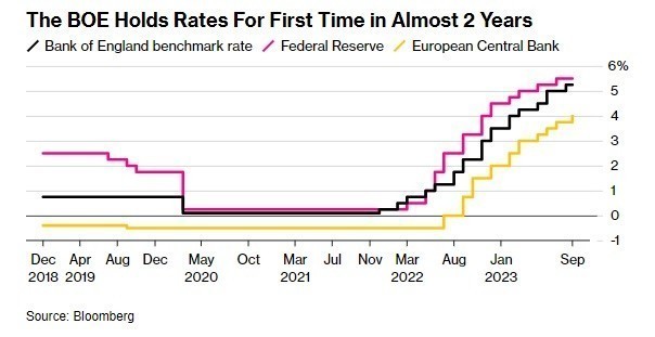 Η απόφαση της Bank of England αποδείχθηκε ευθυγραμμισμένη με τις αντίστοιχες σε ΗΠΑ και Ευρωζώνη, όπου Federal Reserve και Ευρωπαϊκή Κεντρική Τράπεζα διατήρησαν τα επιτόκια σταθερά στο 5,25% – 5,50% και στο 4,5%, αντίστοιχα.