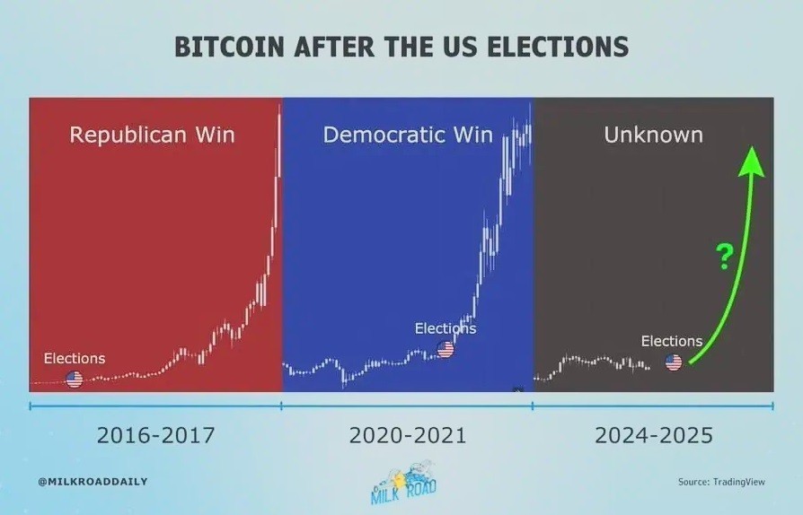 Ιστορικά, το bitcoin έχει επιδείξει ένα μοτίβο σημαντικών ράλι μετά τις αμερικανικές εκλογές. Από το λανσάρισμά του το 2009, το bitcoin έχει περάσει τρεις εκλογικούς κύκλους στις ΗΠΑ και κάθε φορά σημείωσε σημαντικά μετεκλογικά κέρδη χωρίς να επανέλθει στα χαμηλότερα προεκλογικά επίπεδα. Εάν συνεχιστεί αυτή η ιστορική τάση, η τιμή του θα μπορούσε να φτάσει σε νέα υψηλά σε περίπου ένα χρόνο.