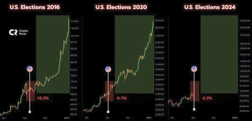 Όπως έχουν επισημάνει πολλοί στο X, το bitcoin τείνει να κάνει βουτιά κατά τη διάρκεια των αμερικανικών εκλογών και στη συνέχεια να πραγματοποιεί ένα σημαντικό ράλι τα επόμενα χρόνια.