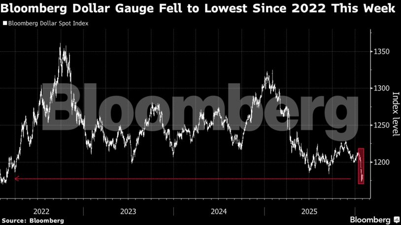 Το δολάριο έχει υποχωρήσει φέτος, στο πλαίσιο του λεγόμενου «debasement trade», δηλαδή του στοιχήματος σε μακροπρόθεσμη αποδυνάμωση της αγοραστικής του δύναμης. Ο δείκτης δολαρίου της Bloomberg κατέγραψε αυτή την εβδομάδα το χαμηλότερο επίπεδο σχεδόν τετραετίας.