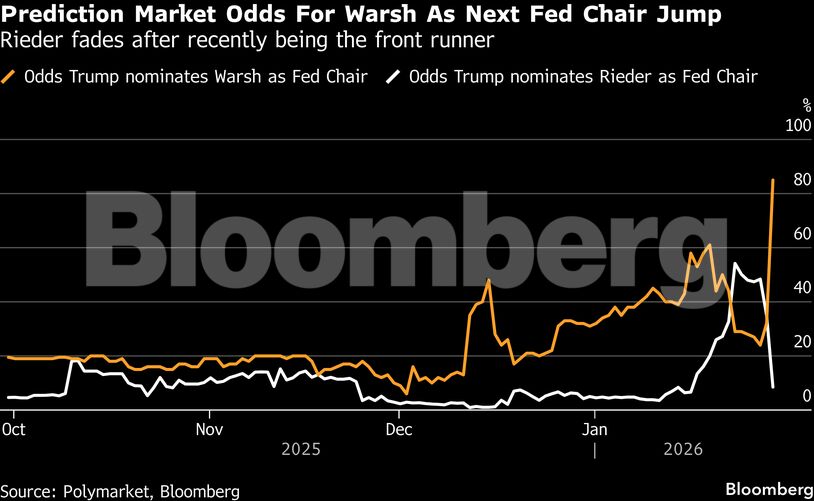 Οι αγορές προβλέψεων στρέφονται ολοένα και περισσότερο υπέρ του Γουόρς. Στην πλατφόρμα Polymarket, η πιθανότητα να αναλάβει την προεδρία της Fed ξεπέρασε το 80% την Παρασκευή στις ασιατικές συναλλαγές, καθώς υποχώρησε η δυναμική υπέρ του στελέχους της BlackRock Inc., Ρικ Ρίντερ. Το προηγούμενο διάστημα, οι ροές σε συμβόλαια επιτοκίων που πόνταραν σε πιο «ήπια» νομισματική πολιτική είχαν ενταθεί, όσο ο Ρίντερ φαινόταν φαβορί και θεωρούνταν πιο «περιστερά» επιλογή σε σχέση με τον Γουόρς.