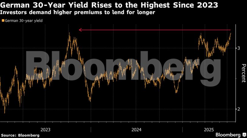 Το κόστος δανεισμού της Γερμανίας για 30ετή ομόλογα ανήλθε στο υψηλότερο επίπεδο από το 2023, καθώς οι αγορές αντιδρούν στους νέους δασμούς των ΗΠΑ και στις προοπτικές αυξημένου κρατικού δανεισμού. Η απόδοση των συγκεκριμένων τίτλων ενισχύθηκε κατά 3 μονάδες βάσης φτάνοντας το 3,25%, επεκτείνοντας τη σημαντική άνοδο του τελευταίου μήνα. Εάν ξεπεράσει το 3,263%, θα αγγίξει επίπεδα που είχαν να εμφανιστούν από το 2011.